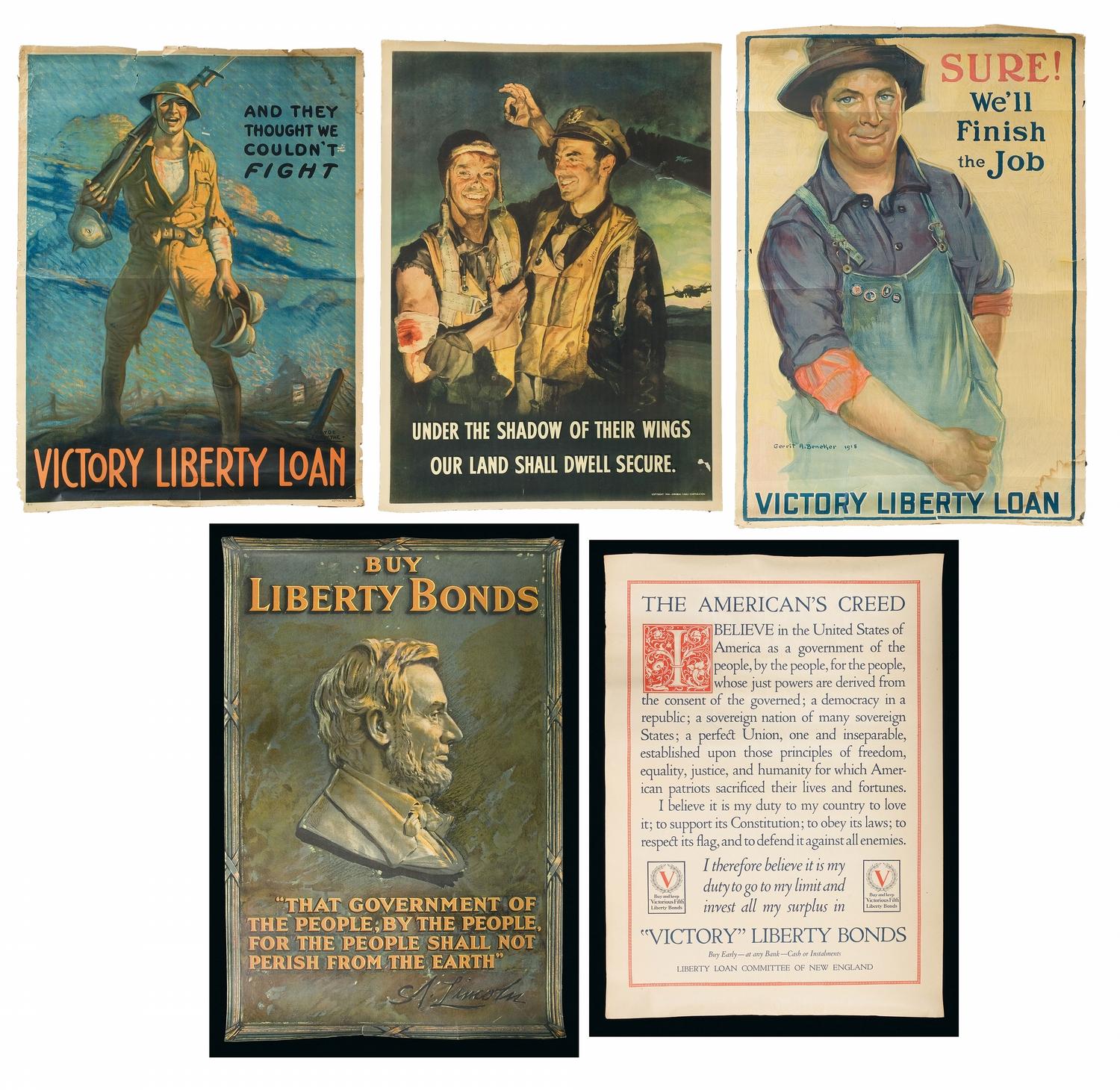 1) 20" x 30", "Buy Liberty Bonds, Abraham Lincoln silhouette, see photo for text. 2) 22" x 16", The American's Creed, Fifth Victory Liberty Bonds. See picture for text. 3) 37" x 27", Air Force poster, copyright 1944. See picture for text. 4) 41" x 30" Victory Liberty Loan, "And They Thought We Couldn't Fight". 5) 38" x 26". 1918, Victory Liberty Loan. Sure We'll Finish the Job".