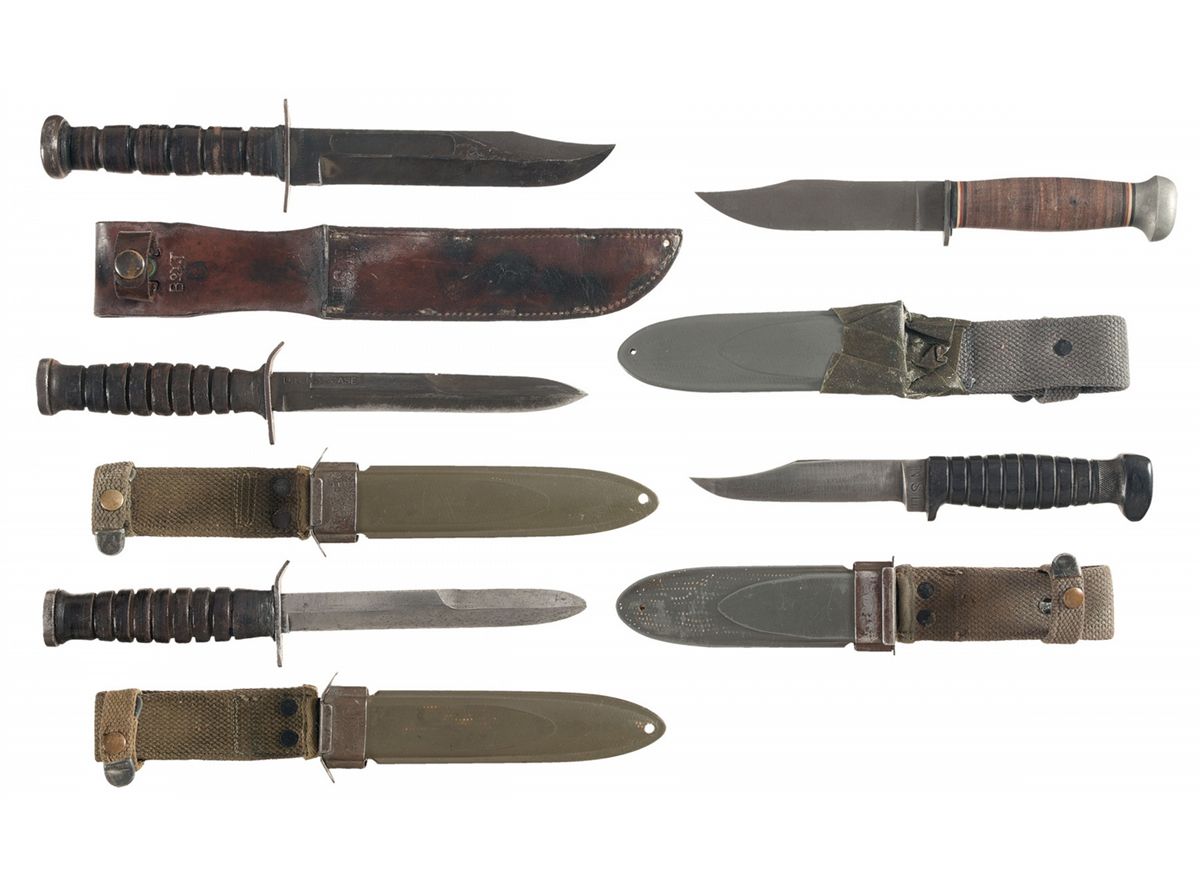 Included in this lot are 1) U.S. Navy Mark II knife with "Robeson/Suredge" marked 7 inch blade and "U.S.N./BOYT 43" marked sheath. 2) U.S. M2/Case marked knife with 6 6/8" blade and "U.S.M.8" marked sheath. 3) U.S. M3 U.S. Army knife with 6 1/2 inch blade and "U.S. M8." marked scabbard. 4) U.S. Navy Mark I knife with 5 1/4" blade with hard sheath. 5) U.S. Navy Mark I knife with 5 1/8" blade and hard sheath marked "USN/MKI" on the front and "NORD-8114/B.M.Co/ 1/2/ VP" on the back.
