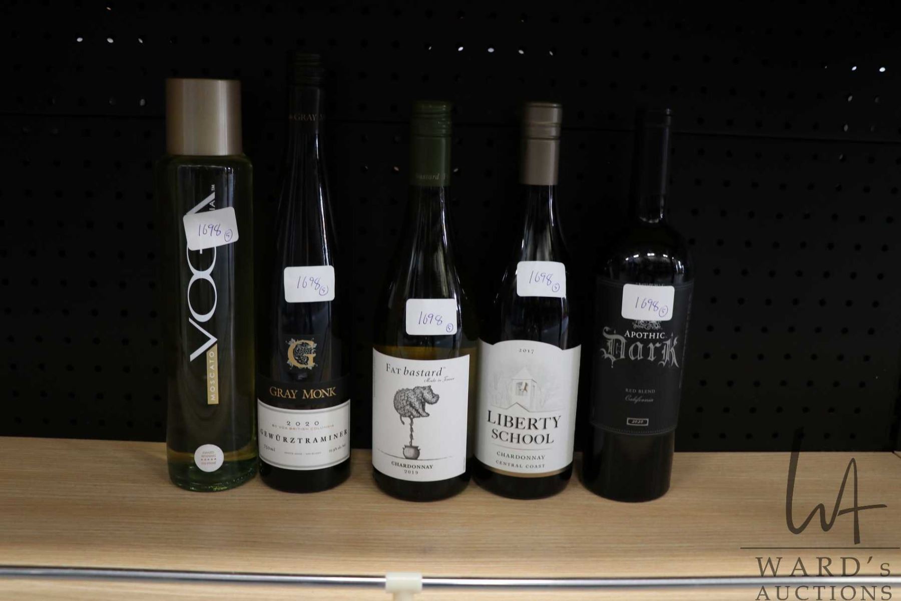Five assorted bottles of wine including a Voga Moscato 750ml / 7.5% ABV, a Gray Monk Gewurztraminer 2020 750ml / 12.9% ABV, a Fat Bastard Chardonnay 2019 750ml, a Liberty School Chardonnay 2017 750ml, and a Apothic Dark Red Blend 2020 750ml Note: Alcohol cannot be insured by any courier in Canada. Local pick up is recommended. Canadian bidders only