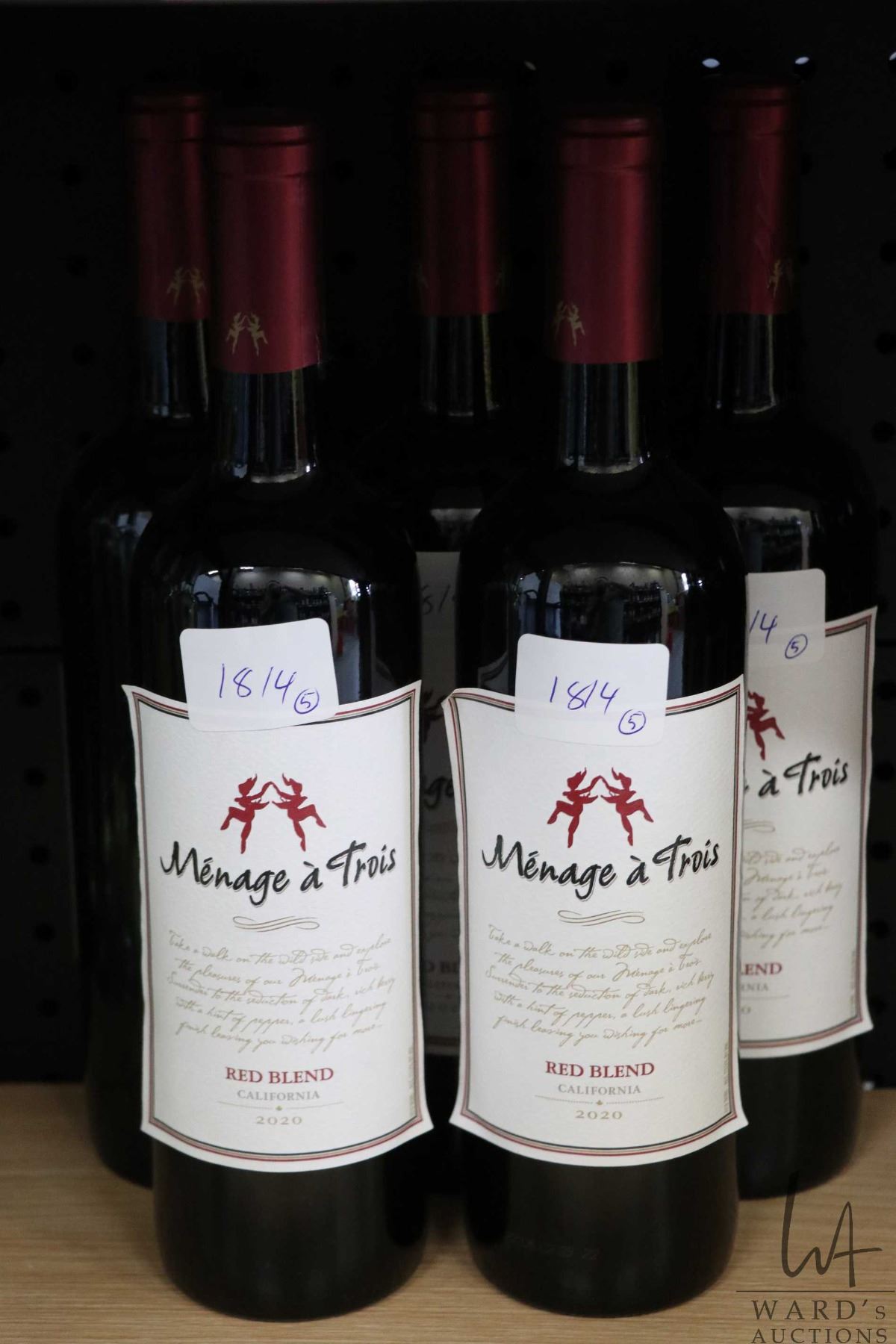 Five bottles of Menage a Trois Red Blend 2020 750ml Note: Alcohol cannot be insured by any courier in Canada. Local pick up is recommended. Canadian bidders only