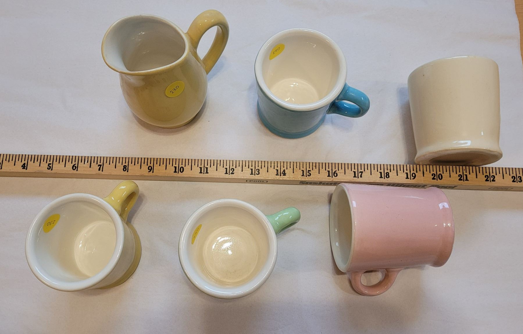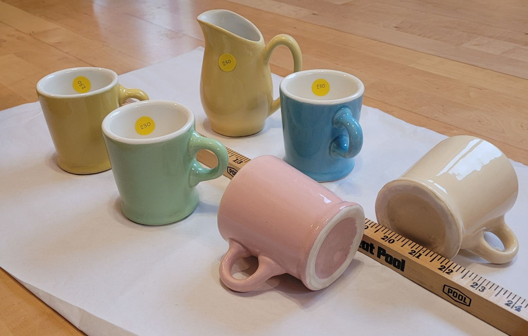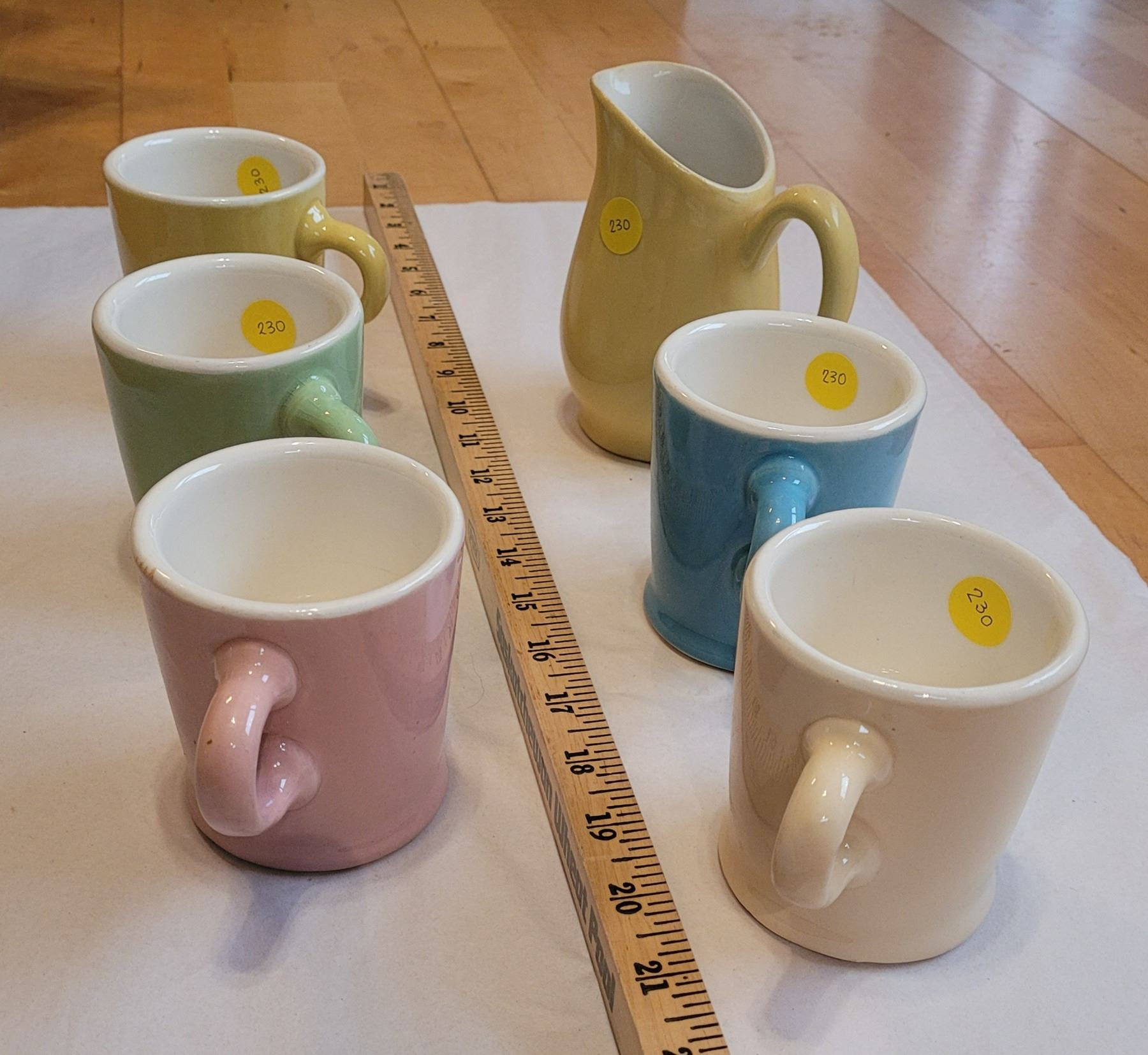 Five colored pottery mugs from Medalta Potteries in Medicine Hat and one matching yellow pitcher