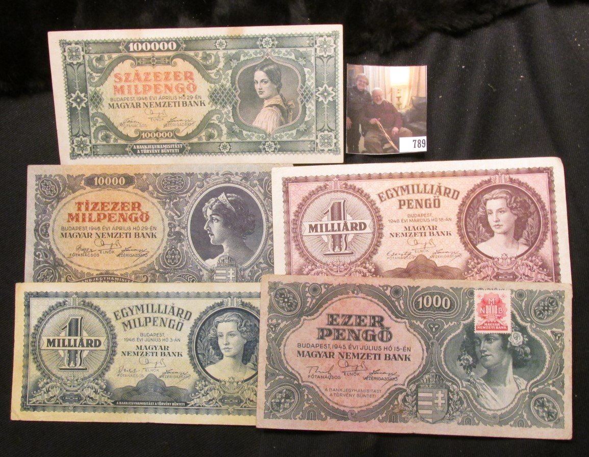 Five different 1945-46 Hungary Banknotes including $10,000 to One Million Pengos.