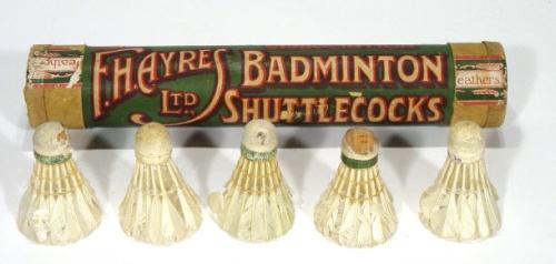 Five feathered Edwardian badmington shuttlecocks in original printed packaging, 40cm long