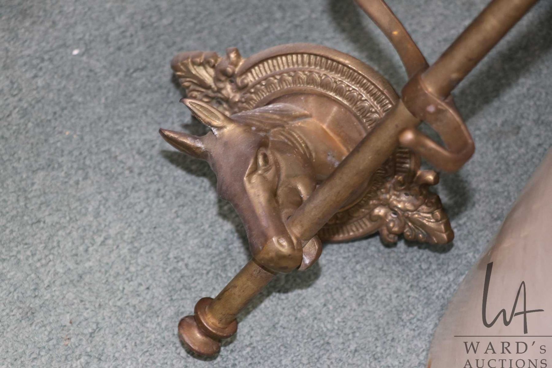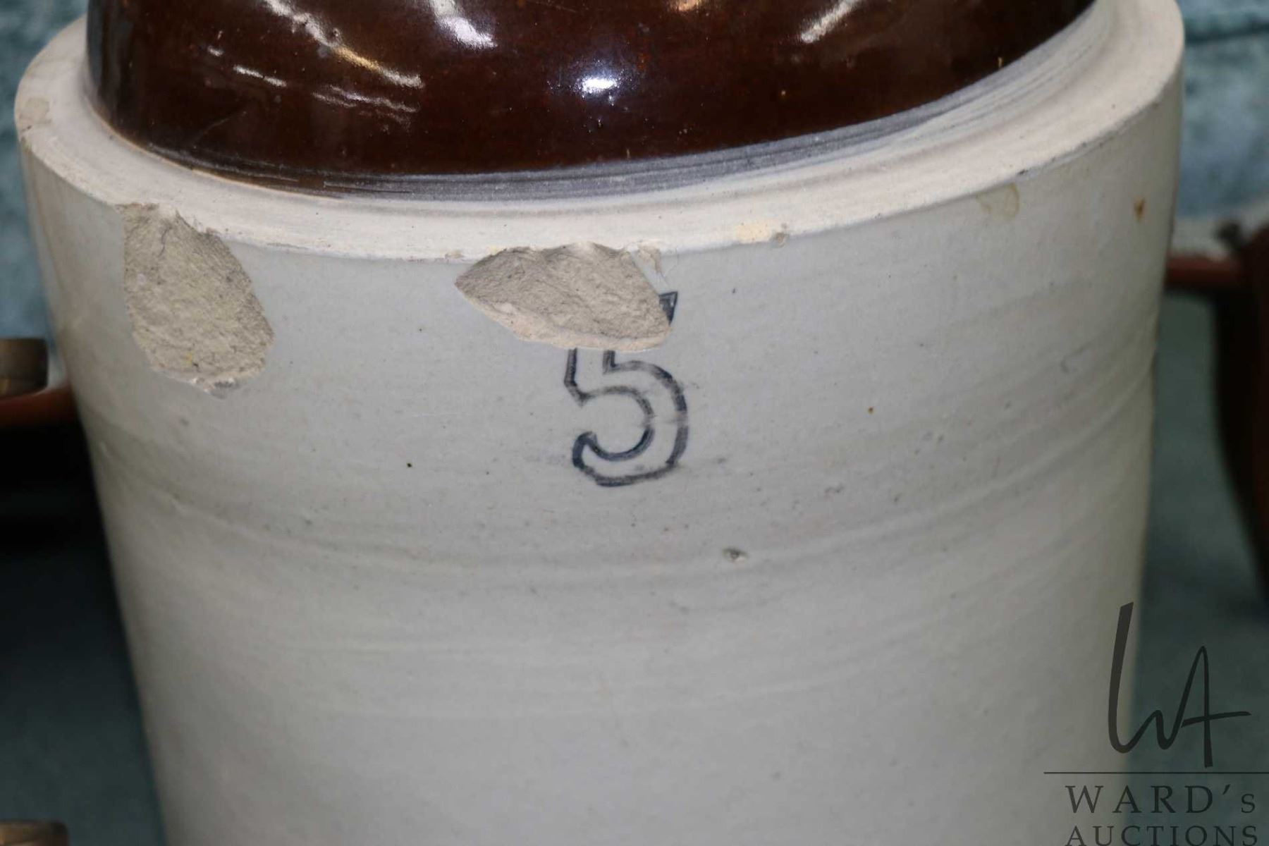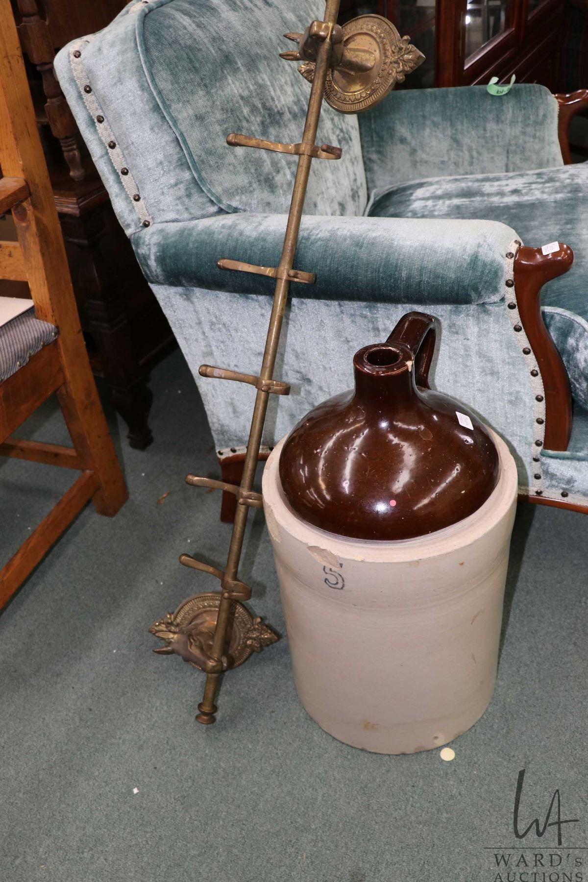 Five gallon stoneware jug and a horse motif wall mount coat rack. Note: Not available for shipping.