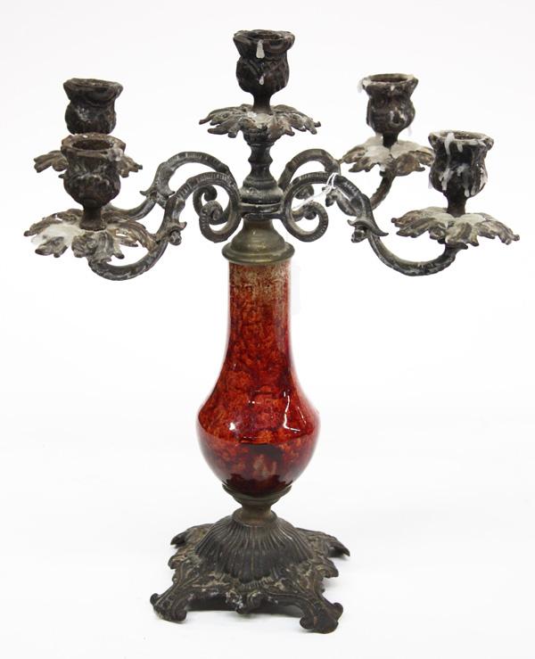 19th century patinated metal five light candelabra having a red mottled glass standard, 13''