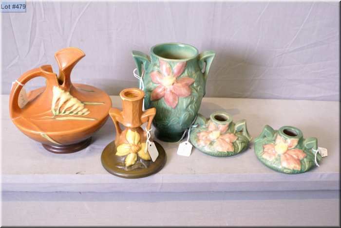 Five pieces of Roseville Pottery including Clematis candle holders and double handled vases, a candlestick and a Freesia jug, note repair to spout