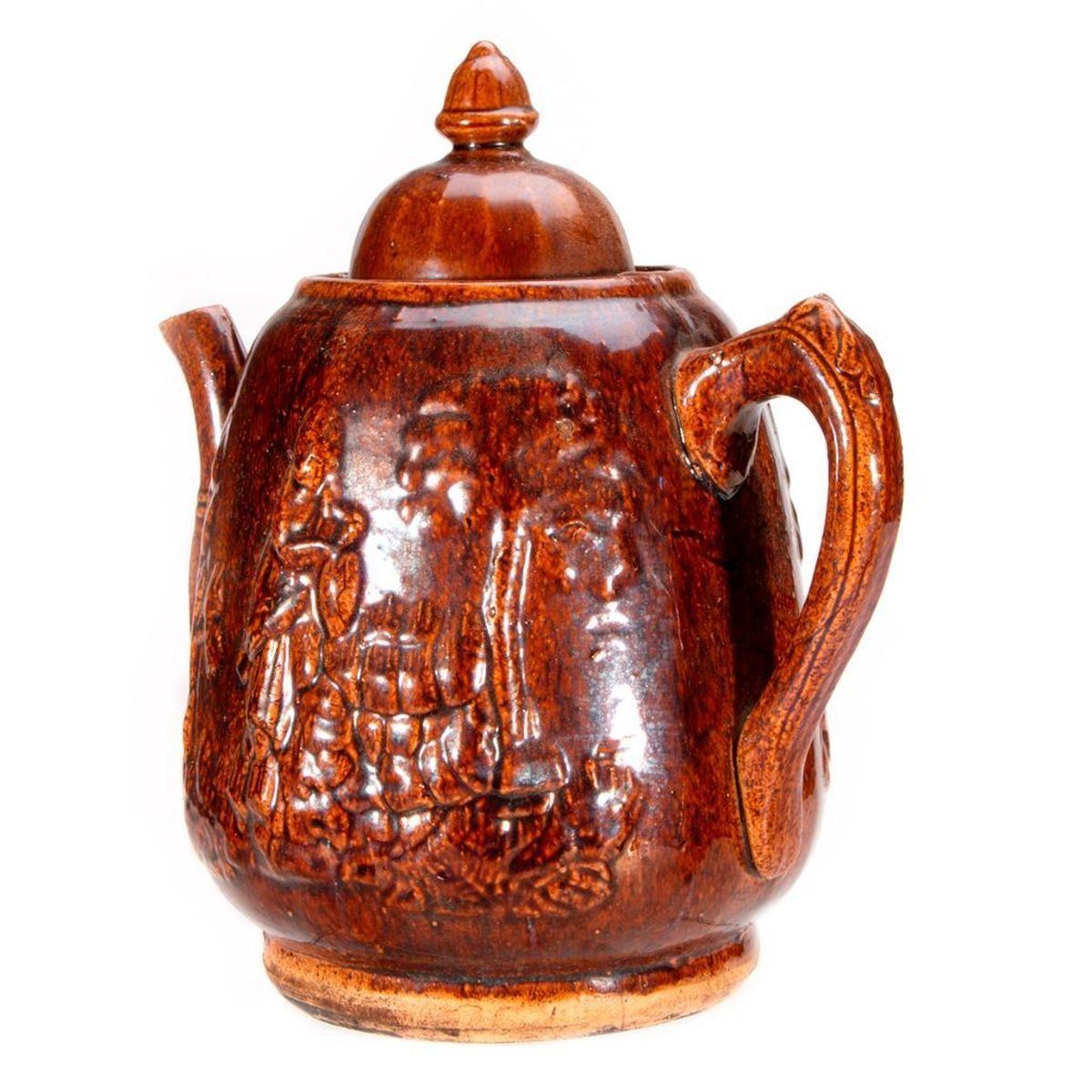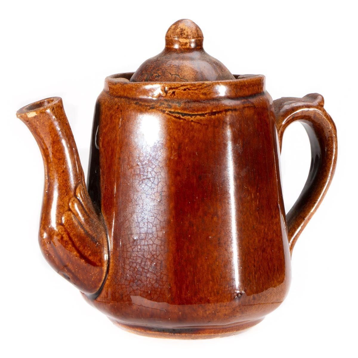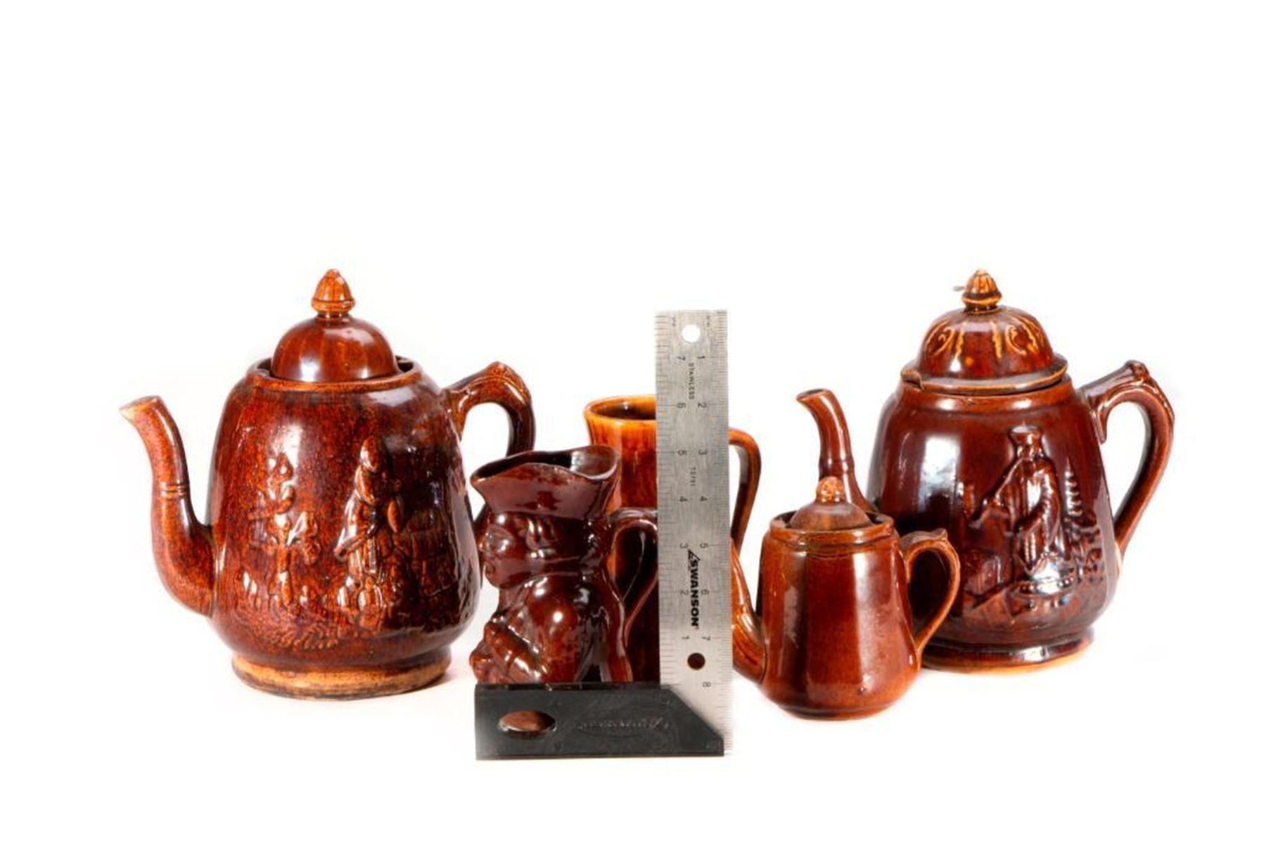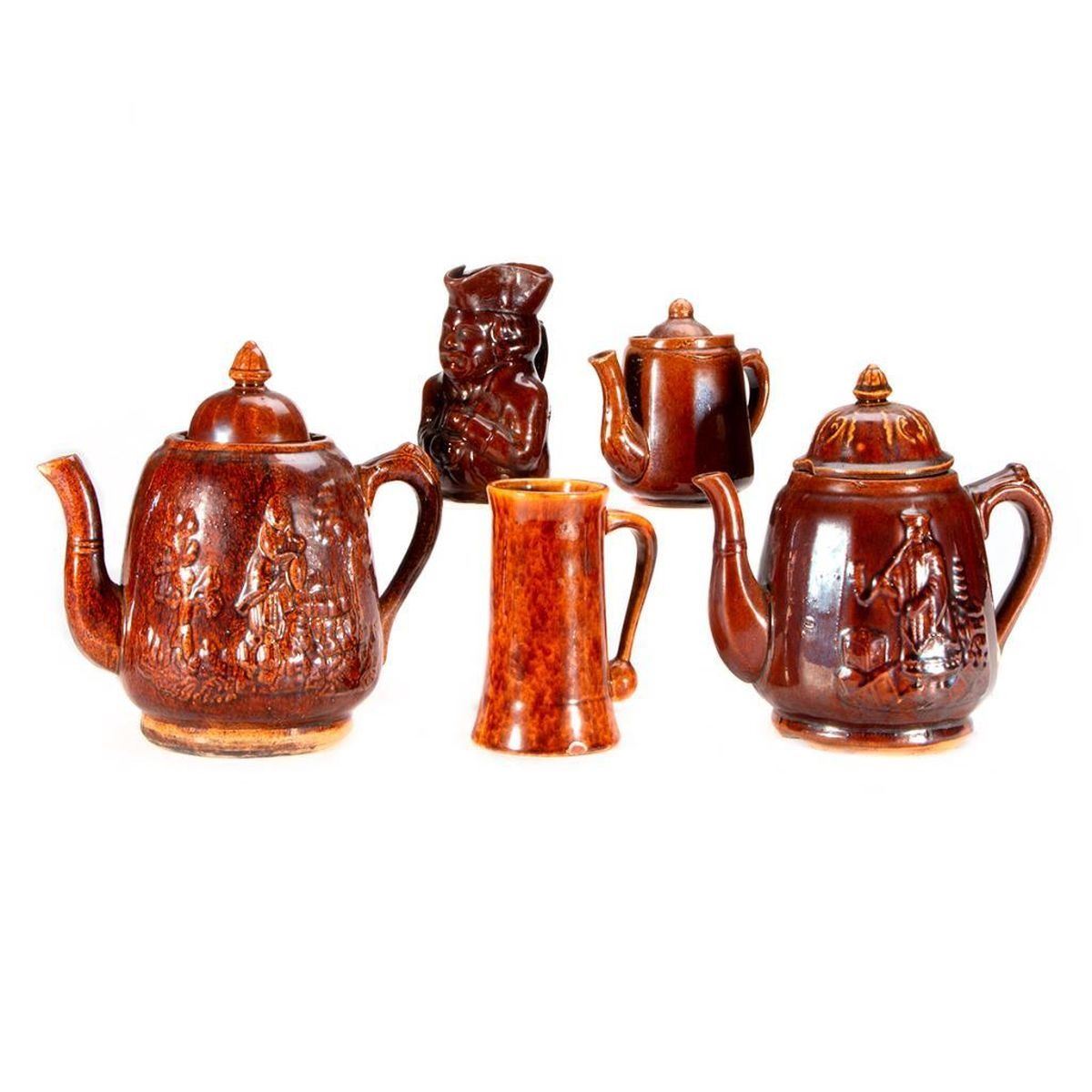 Five pieces of 19th and 20th century redware pottery including a teapot, vase, creamer and two coffee pots, the largest 9 inches high.