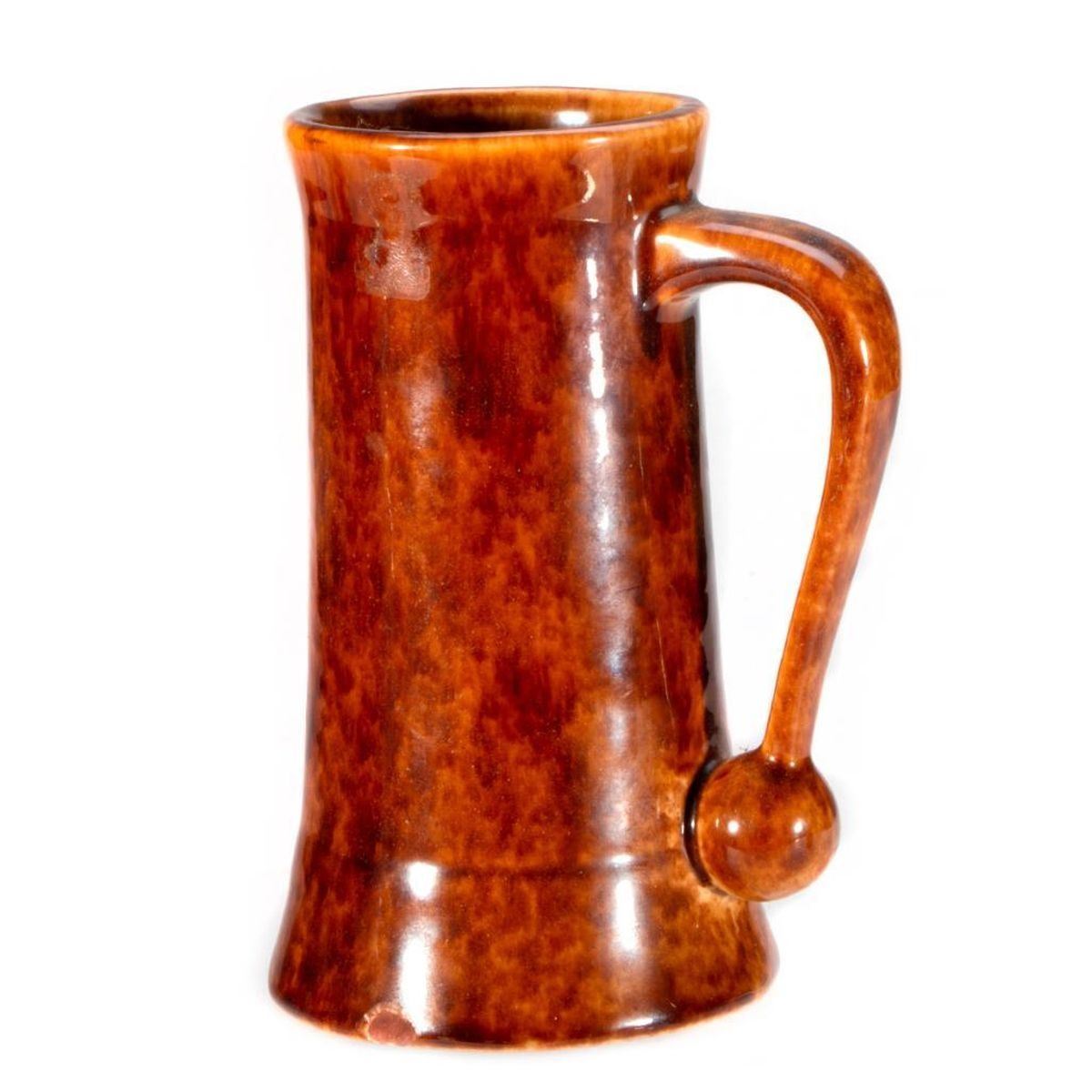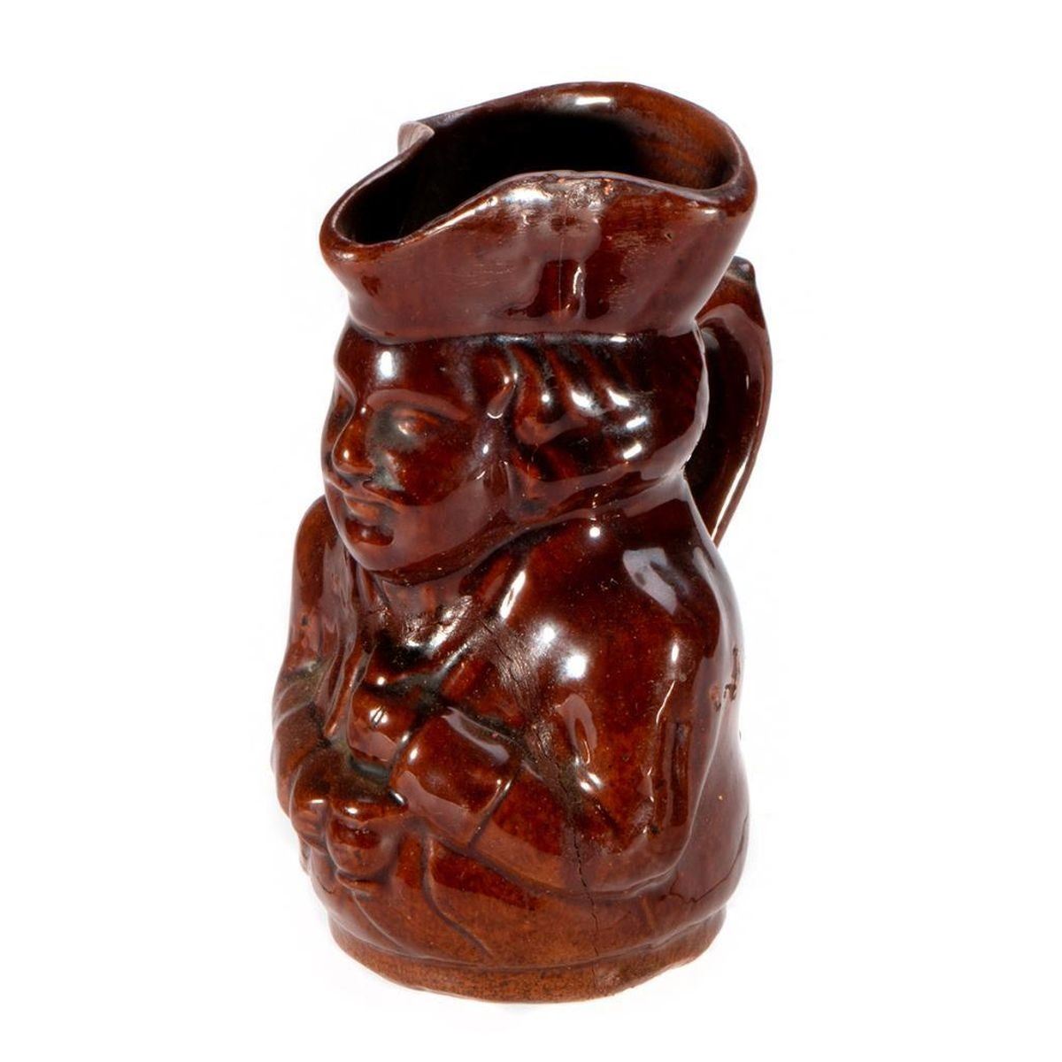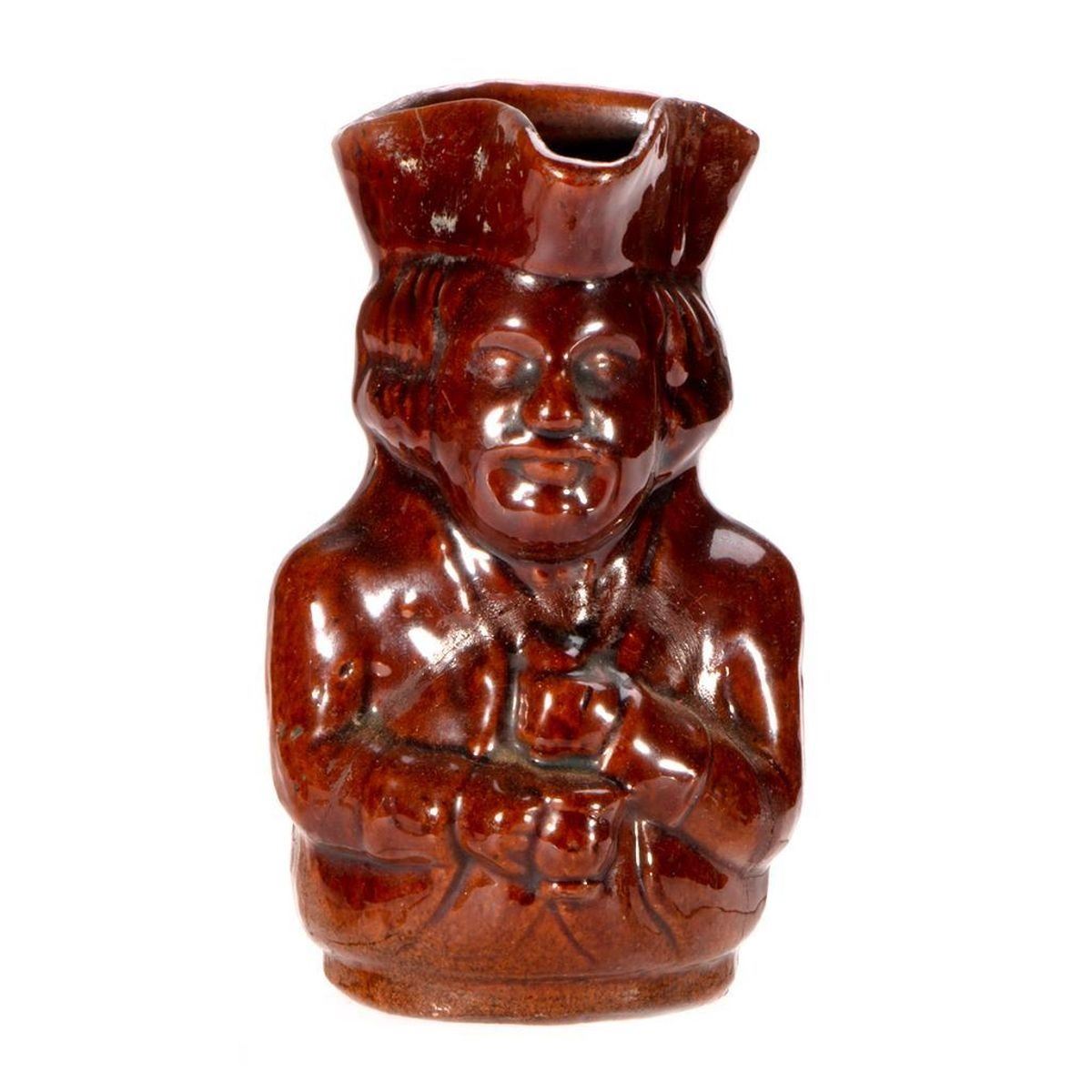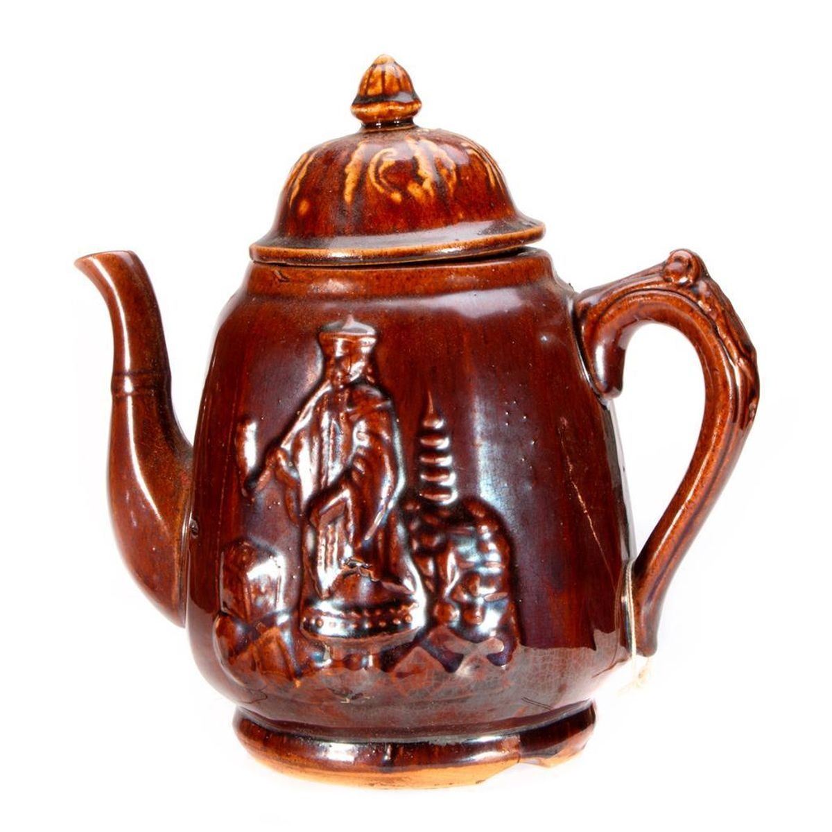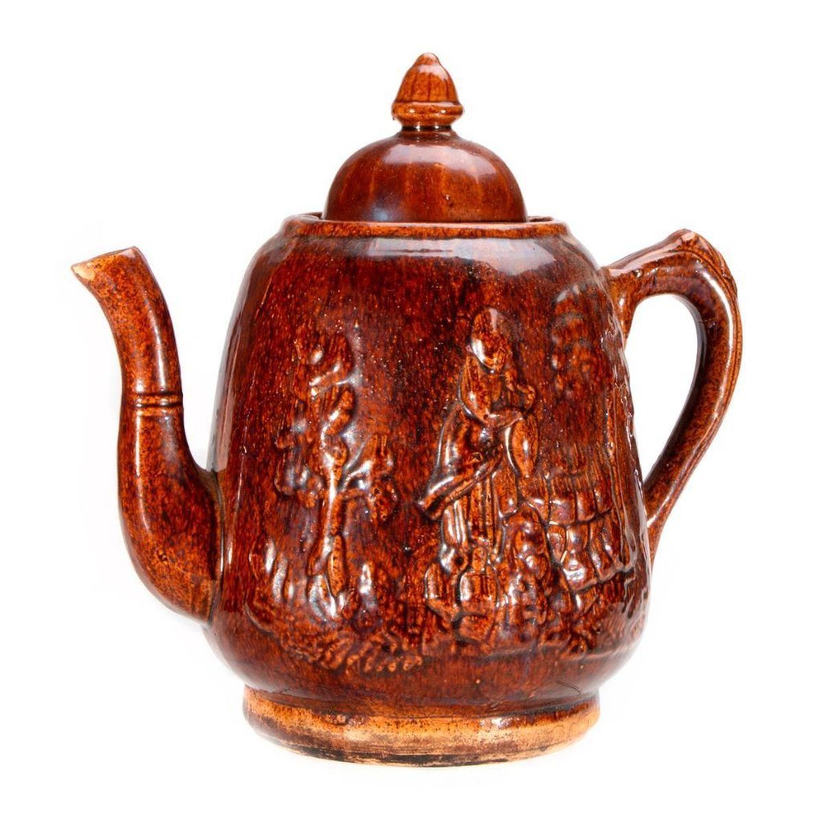 Five pieces of 19th and 20th century redware pottery including a teapot, vase, creamer and two coffee pots, the largest 9 inches high.
