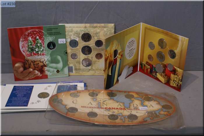 Five sets of Canadian collector's coins including 2005, 2006 and 2007 Holiday sets, a 1996 un-circulated $2 bank note and $2 coin set, Canadian Millennium Provincial quarters collector's set and a First day of Issue Canada Post golf stamps