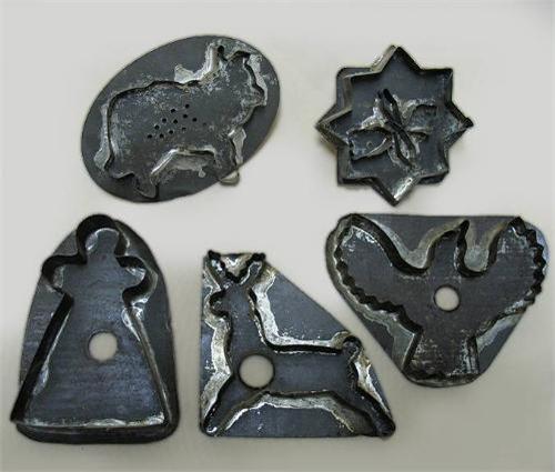 Five tin cookie cutters including pig 4 1/2" x 3 1/4"; bird in flight 3 3/4" x 5"; woman 4 1/2" x 3 1/4"; deer 4" x 3 3/4" and star 3 1/4" x 3";late 19th C. (no visible defects)