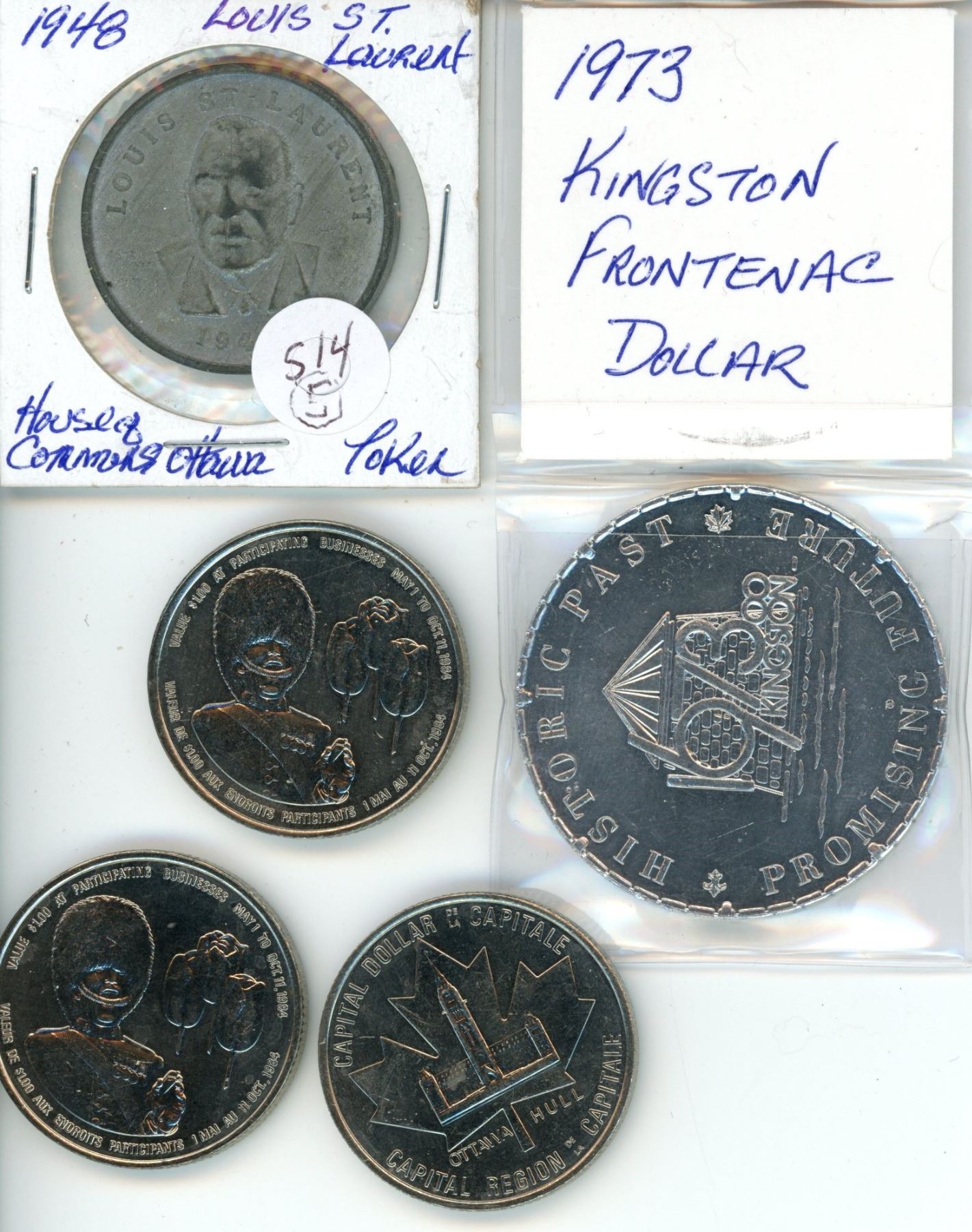 Five token lot - (3) Ottawa Hull $1.00 value, 1973 Kingston Frontenac dollar, 1948 house of commons