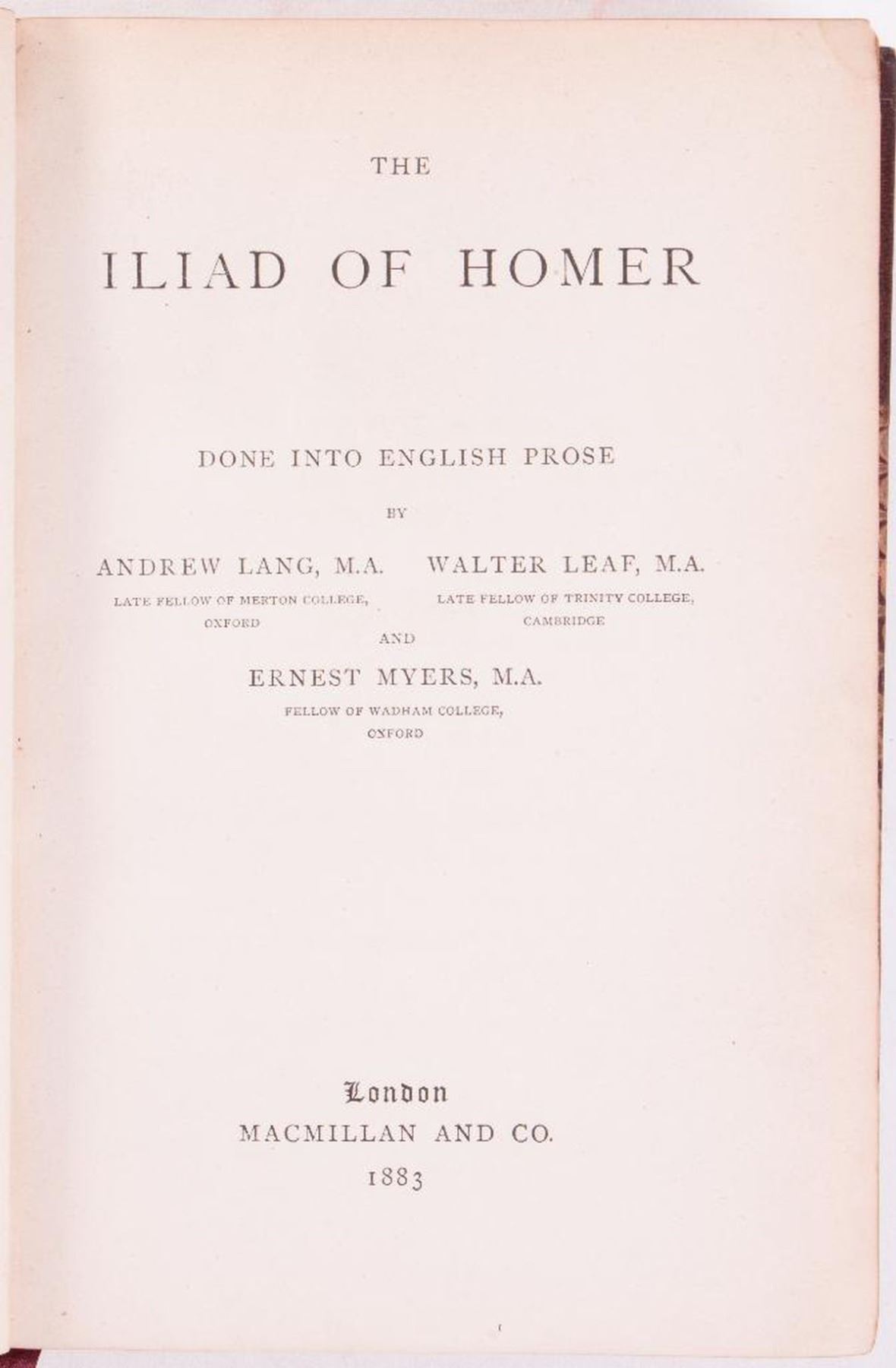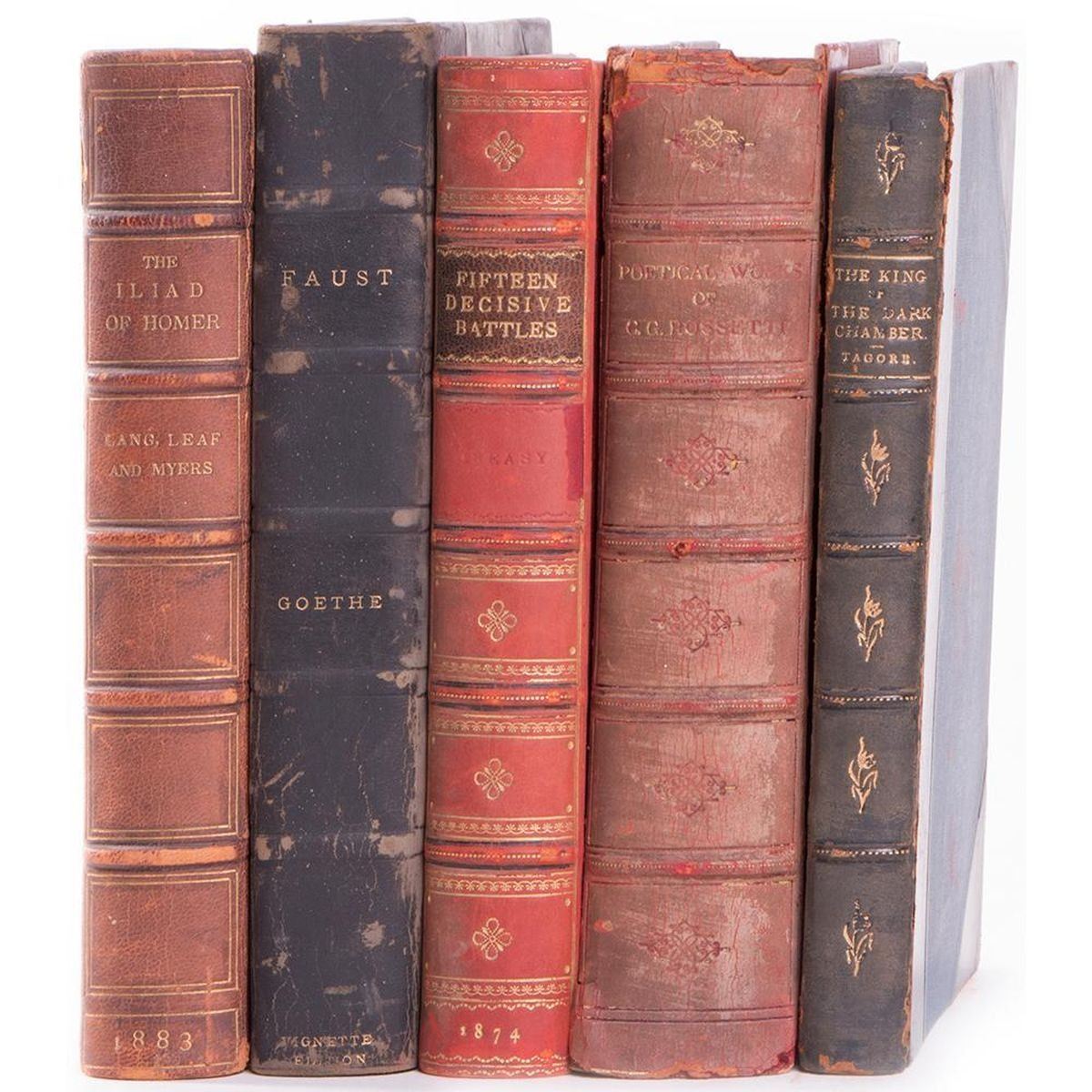 Description: Five various works Includes: The Iliad by Homer. Published in 1883 by Macmillan & Co., London. Beautiful edition of a the Iliad. Leather spine and edges in brown with floral motifs. Marbled boards and matching endpapers. Title: Faust by Goethe. Leather board edges and spine. Published in 1890 by Frederick A Stokes Company, New York. Marbled boards and matching endpapers. Title: The King of the Dark Chambers by Rabindranath Tagore. Published in 1915 by Macmillan & Co. London. Bound in blue leather and blue cloth. Title: Fifteen Decisive Battles by Sir Edward Creasy. Published in 1874 by Richard Bentley & Son, London. Red leather and marbled boards. Gilt lettering and decorations. Title: The Poetical Works of Christina Georgina Rossetti. Published in 1908 by Macmillan & Co. London. Red leather and cloth binding. Condition: Good- Very good condition. Bumping to edges, and bottom of spines. Spines has chips and rubbed leather.