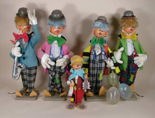 Five wire construction clown figures, one measuring 15 inches, four measuring between 25 inches to 27 inches. Good Cond.