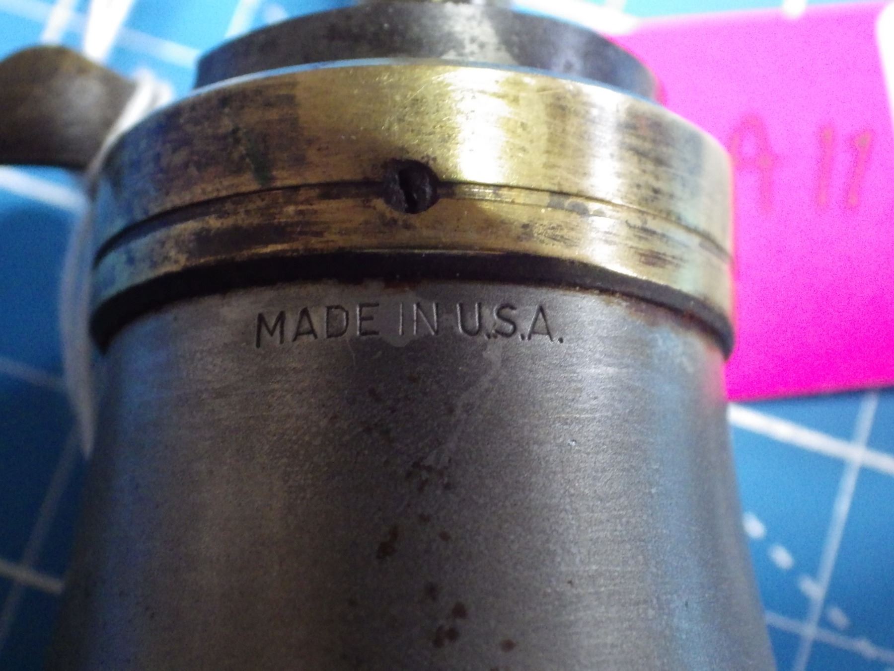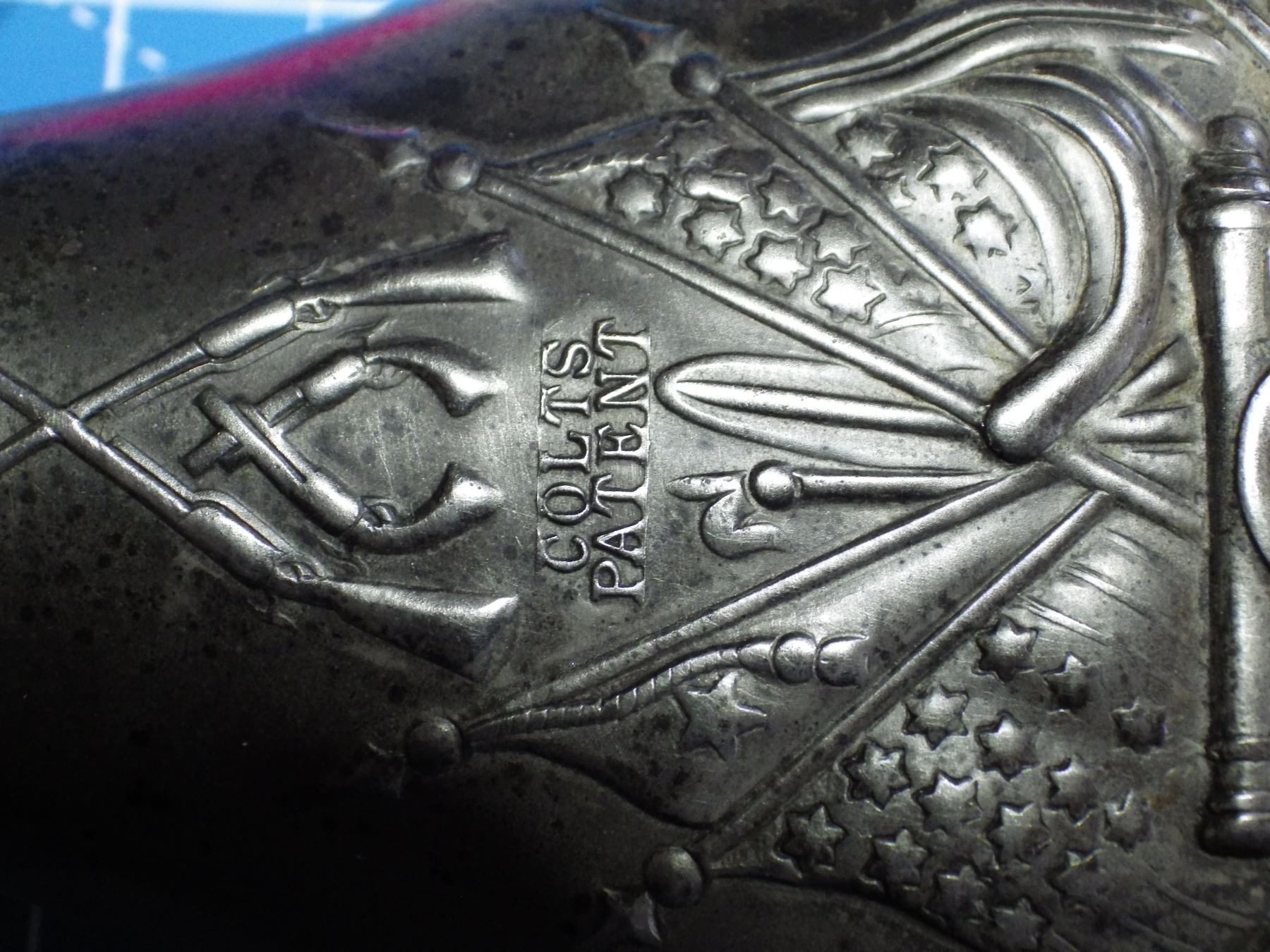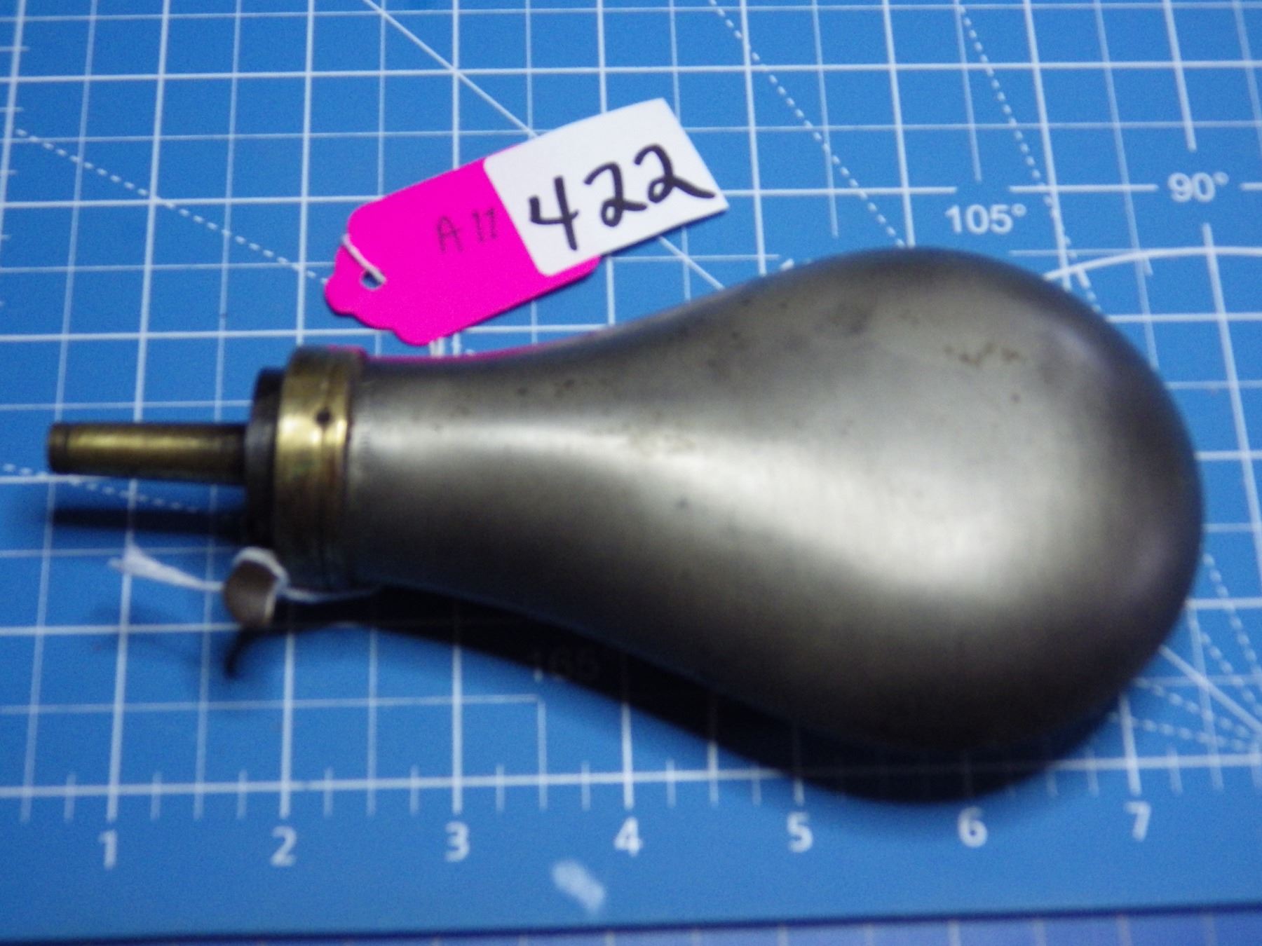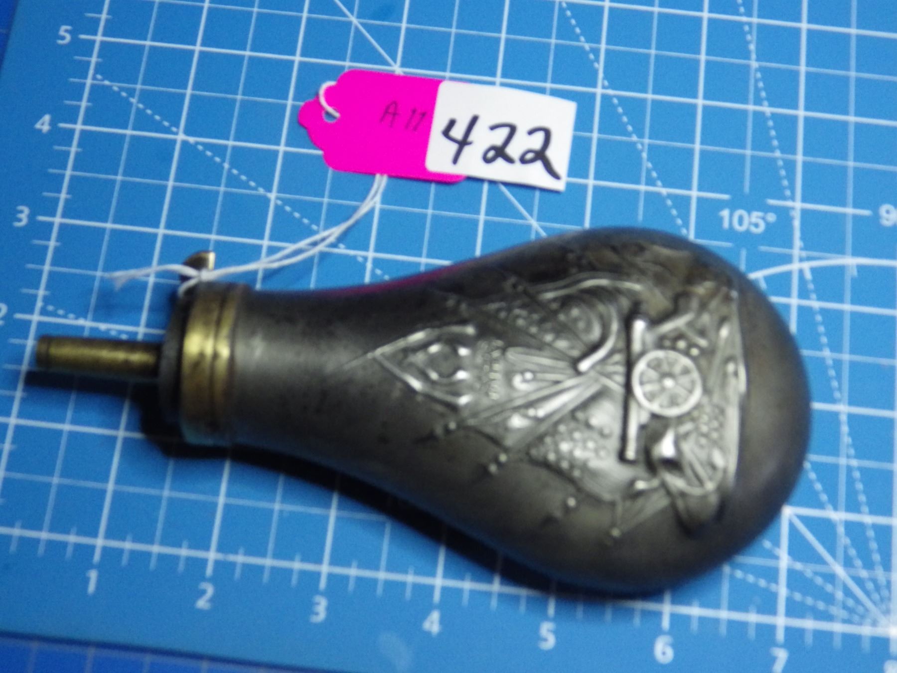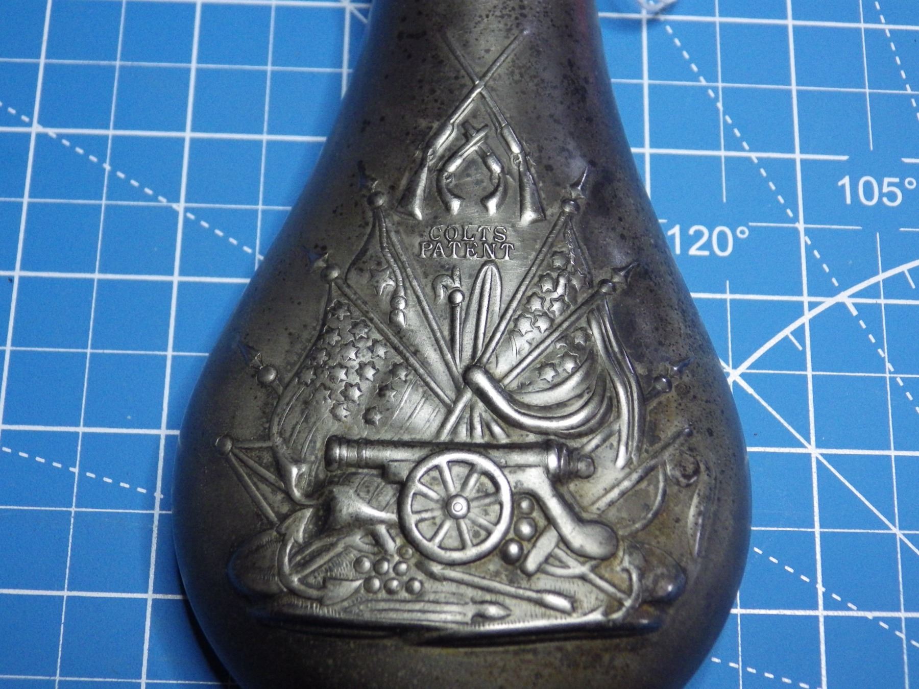 Fixed tin powder measure, stand of arms design with "Colts Patent" on one side and "Made in USA" on the other side, body is 3 " X 5 1/2", spring works, -- CONSIGN # A11