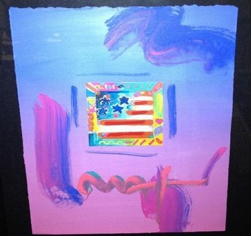 "Flag W/ Hearts" Peter Max Original Mixed Media - Professionally Framed & Matted - Hand Signed And Embellished By Peter Max - Authenticated With Max Gallery Copyright Stamp And Serial Number On The Back - Paper 8.5" X 11"