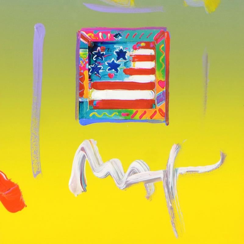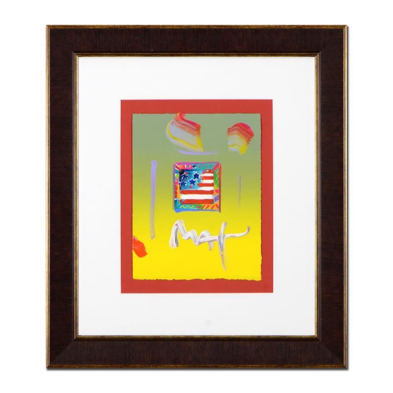 "Flag" is a one-of-a-kind acrylic mixed media on paper, hand signed by Peter Max. This piece comes custom framed. Includes Certificate of Authenticity from Peter Max Studios. Measures approx. 19.5" x 22.5" (with frame), 8.5" x 11" (image).