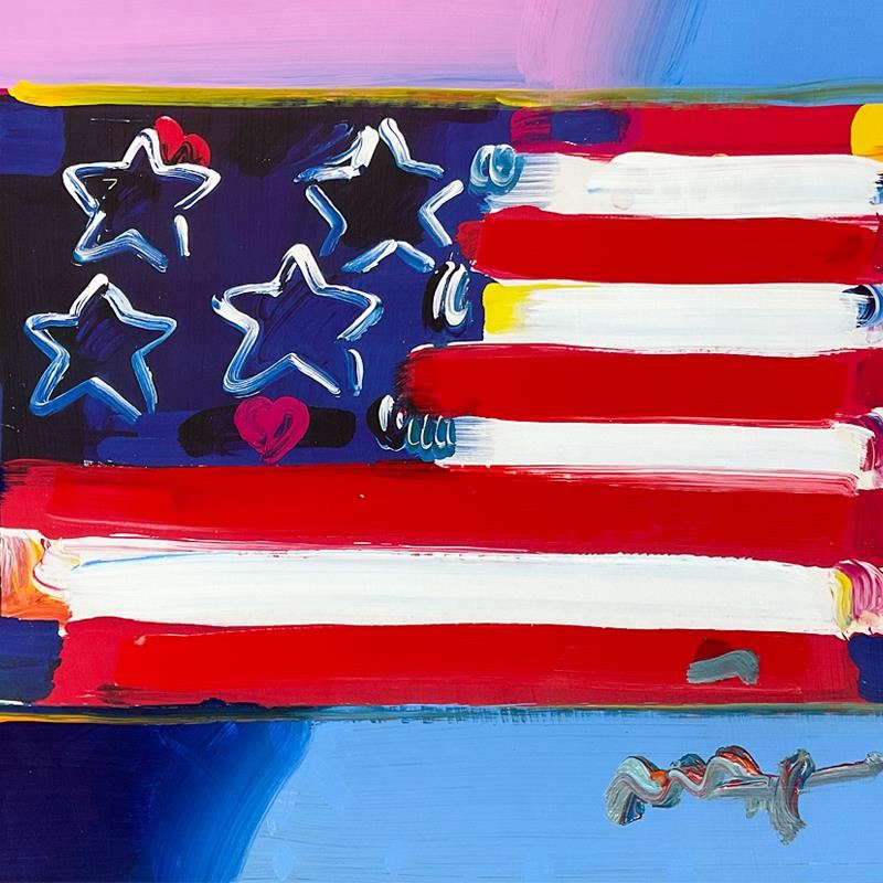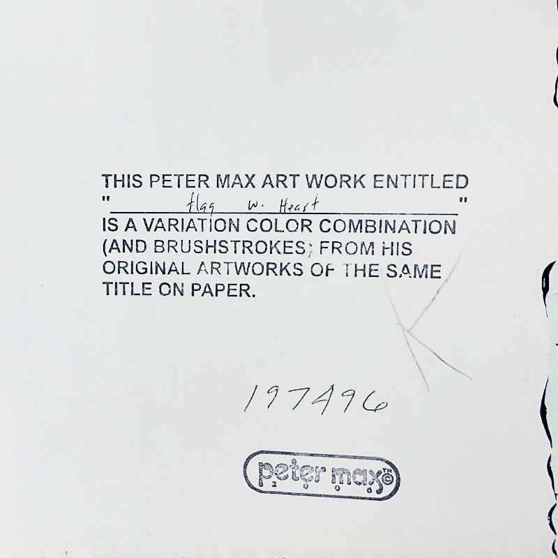 "Flag" is a one-of-a-kind acrylic mixed media on paper, hand signed by Peter Max. The piece comes custom framed with a backside cutout to display Peter Max Studio registration number 197496 certifying authenticity. Measures approx. 29" x 35" (frame), 18" x 24" (image).