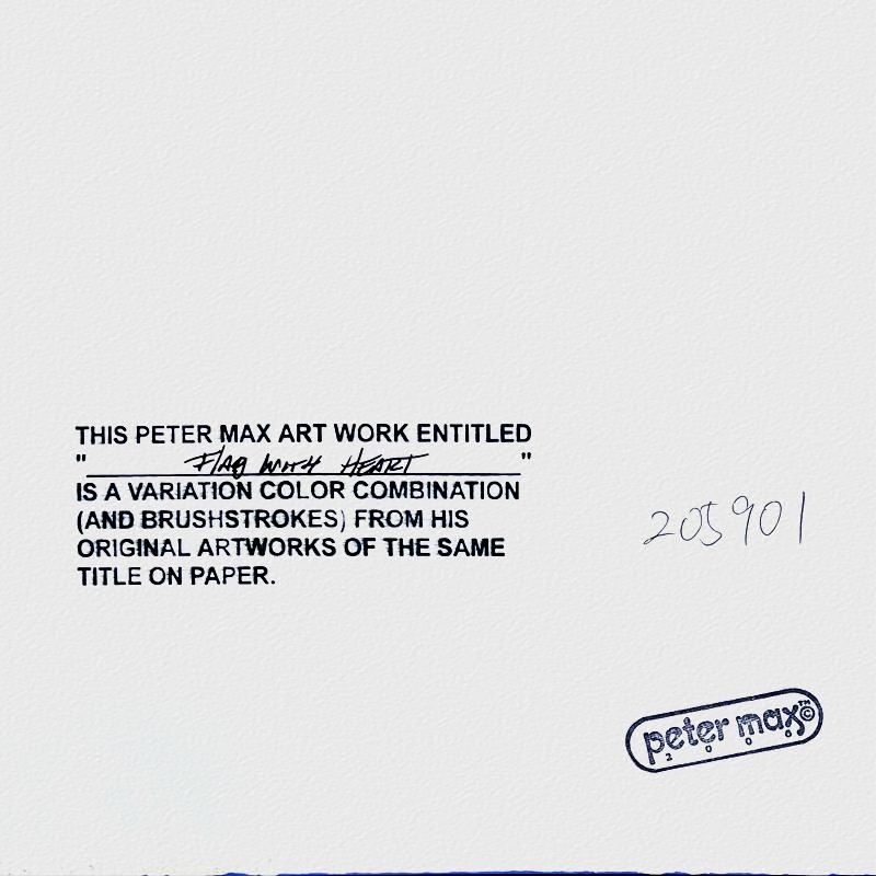 "Flag" is a one-of-a-kind mixed media on paper, hand signed by Peter Max. The piece comes custom framed with a backside cutout to display Peter Max Studio registration number 205901 certifying authenticity. Measures approximately 24" x 30" (frame), 18" x 24" (image). This item requires special handling and may have a longer than usual turnaround.