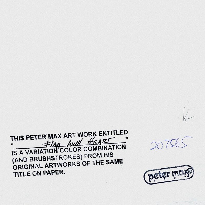 "Flag" is a one-of-a-kind mixed media on paper, hand signed by Peter Max. The piece comes custom framed with a backside cutout to display Peter Max Studio registration number 207565 certifying authenticity. Measures approximately 29" x 35" (frame), 18" x 24" (image). This item requires special handling and may have a longer than usual turnaround.