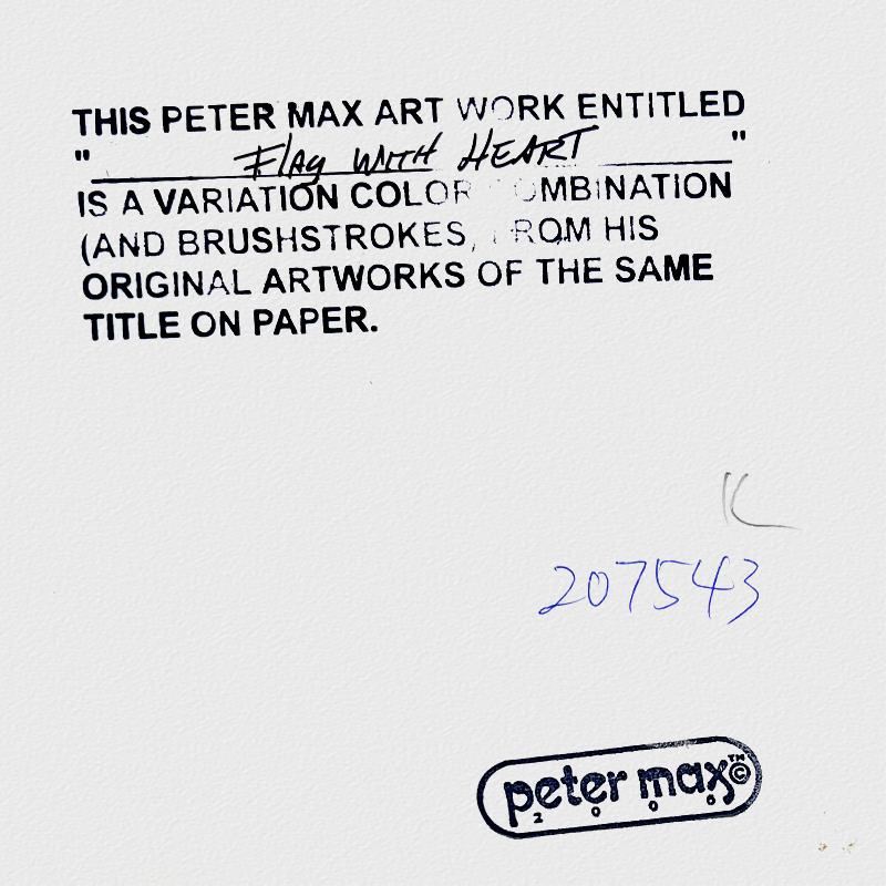 "Flag" is a one-of-a-kind mixed media on paper, hand signed by Peter Max. The piece comes custom framed with a backside cutout to display Peter Max Studio registration number 207543 certifying authenticity. Measures approximately 29" x 35" (frame), 18" x 24" (image). This item requires special handling and may have a longer than usual turnaround.