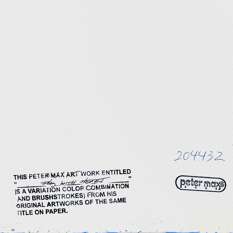 "Flag" is a one-of-a-kind mixed media on paper, hand signed by Peter Max. The piece comes custom framed with a backside cutout to display Peter Max Studio registration number 204432 certifying authenticity. Measures approximately 29" x 35" (frame), 18" x 24" (image). This item requires special handling and may have a longer than usual turnaround.