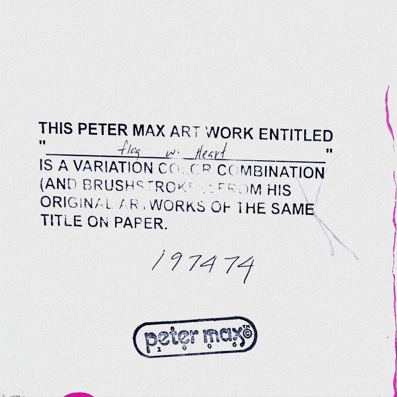 "Flag" is a one-of-a-kind mixed media on paper, hand signed by Peter Max. The piece comes custom framed with a backside cutout to display Peter Max Studio registration number 197474 certifying authenticity. Measures approximately 29" x 35" (frame), 18" x 24" (image). This item requires special handling and may have a longer than usual turnaround.