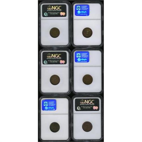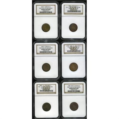 <B>Flag of Our Union Civil War Lot.</B></I> Six pieces, all featuring the Flag of Our Union motif paired with differing reverses: an <B>1863 Flag of Our Union, Fuld-209/414A, R.2, AU58 NGC,</B></I> (two pieces) paired with the humorous SHOOT HIM ON THE SPOOT misspelling; <B>1863 Flag of Our Union, Fuld-210/408A, R.1, MS63 Brown NGC,</B></I> this time with SHOOT HIM ON THE SPOT, lustrous and olive-brown; <B>1863 The Flag of Our Union, Fuld-212/415A, R.2, MS64 Red and Brown NGC,</B></I> only one inner circle on this reverse, plum and blue toning, choice; <B>(1861-65) Flag of Our Union, Fuld-214/416A,R.1,</B></I> two pieces, one MS63 Brown NGC and the other MS65 Brown, lustrous and sharp. Catalog value is about $185 in MS60. This group, with several high-grade pieces, should bring considerably more.<BR><BR><b>Shipping:</b> Coin/Currency (<a target="_blank" href="http://www.heritageauctions.com/common/shipping.php">view shipping information</a>)