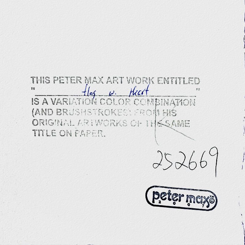 "Flag with Heart" is a hand signed one-of-a-kind acrylic mixed media on paper by Peter Max. The piece comes custom framed with a backside cutout to display Peter Max Studio registration number 252669 certifying authenticity. Measures approximately 30" x 26" (frame), 17" x 13" (image).