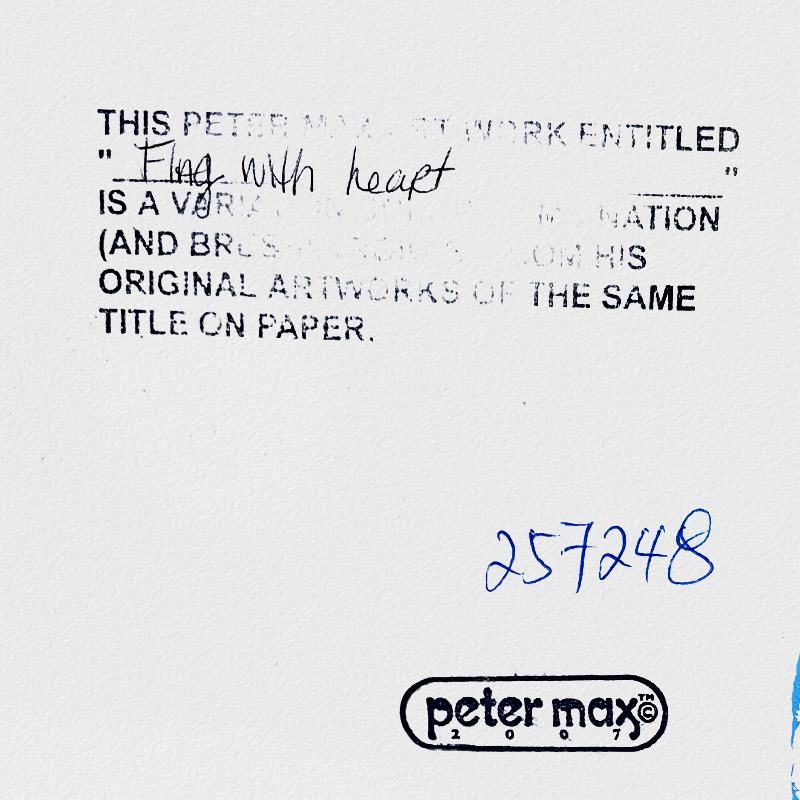 "Flag with Heart" is a hand signed one-of-a-kind acrylic mixed media on paper by Peter Max. The piece comes custom framed with a backside cutout to display Peter Max Studio registration number 257248 certifying authenticity. Measures approximately 30" x 26" (frame), 17" x 13" (image). This item requires special handling and may have a longer than usual turnaround.