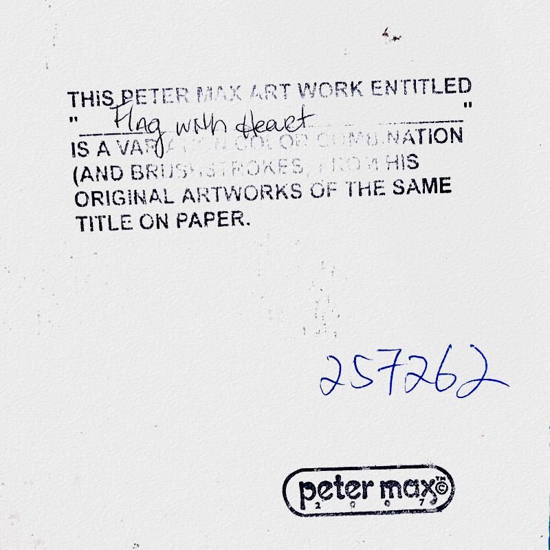"Flag with Heart" is a hand signed one-of-a-kind acrylic mixed media on paper by Peter Max. The piece comes custom framed with a backside cutout to display Peter Max Studio registration number 257262 certifying authenticity. Measures approximately 30" x 26" (frame), 17" x 13" (image). This item requires special handling and may have a longer than usual turnaround.