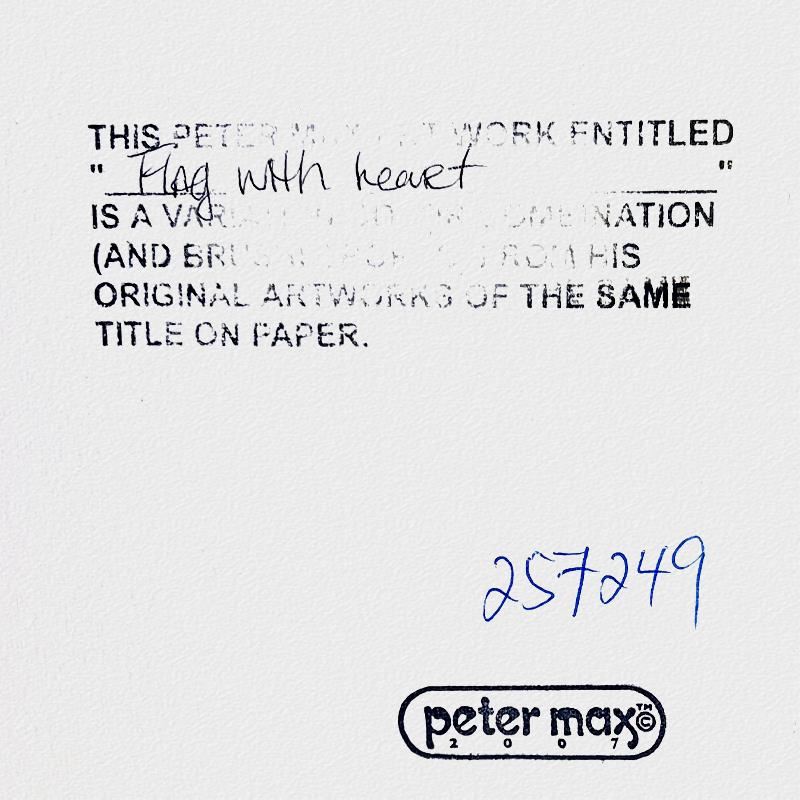"Flag with Heart" is a hand signed one-of-a-kind acrylic mixed media on paper by Peter Max. The piece comes custom framed with a backside cutout to display Peter Max Studio registration number 257249 certifying authenticity. Measures approximately 30" x 26" (frame), 17" x 13" (image). This item requires special handling and may have a longer than usual turnaround.