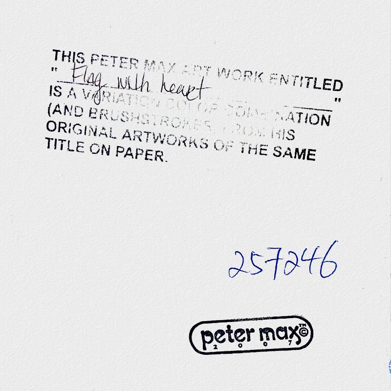 "Flag with Heart" is a hand signed one-of-a-kind acrylic mixed media on paper by Peter Max. The piece comes custom framed with a backside cutout to display Peter Max Studio registration number 257246 certifying authenticity. Measures approximately 30" x 26" (frame), 17" x 13" (image). This item requires special handling and may have a longer than usual turnaround.