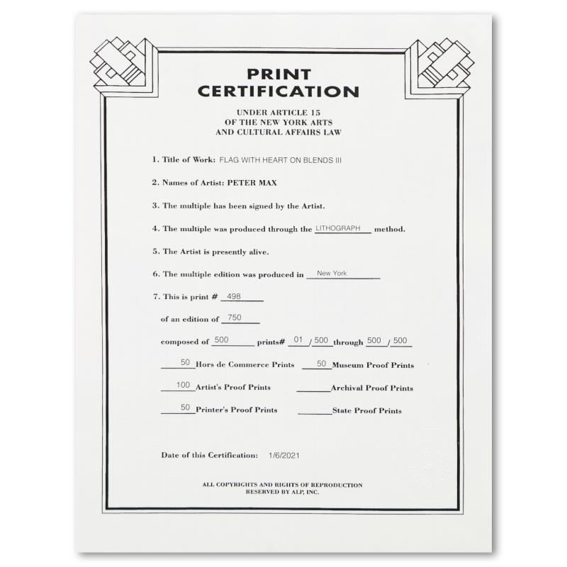 "Flag with Heart on Blends III" is a limited edition lithograph on paper by Peter Max, numbered 498/500 and hand signed by the artist. This piece comes framed. Includes Certificate of Authenticity from Peter Max Studios. Measures approximately 25.5" x 29.5" (frame), 13" x 17" (image).
