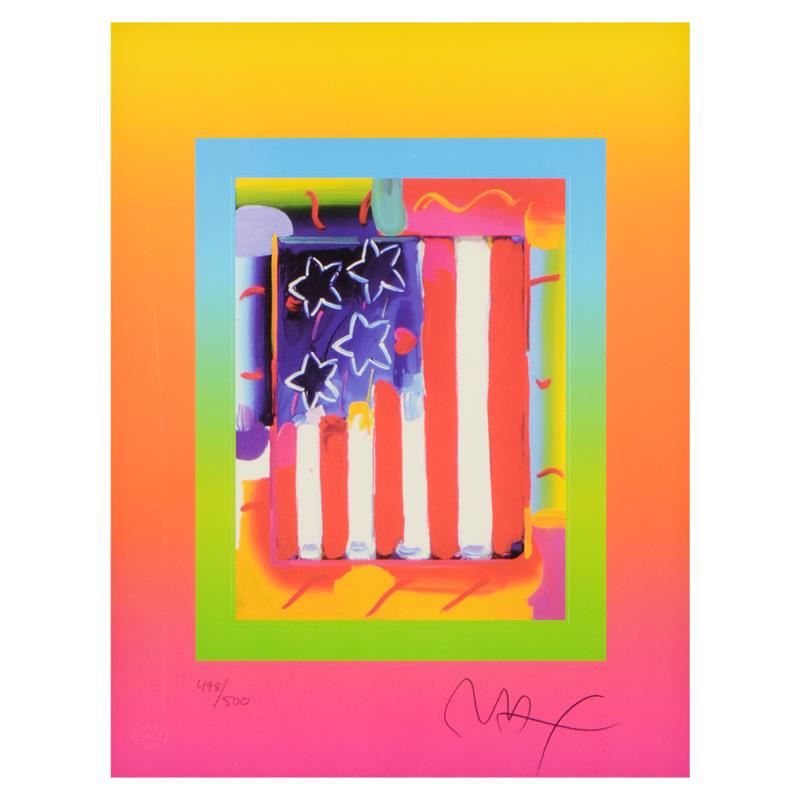 "Flag with Heart on Blends III" is a limited edition lithograph on paper by Peter Max, numbered 498/500 and hand signed by the artist. This piece comes framed. Includes Certificate of Authenticity from Peter Max Studios. Measures approximately 25.5" x 29.5" (frame), 13" x 17" (image).