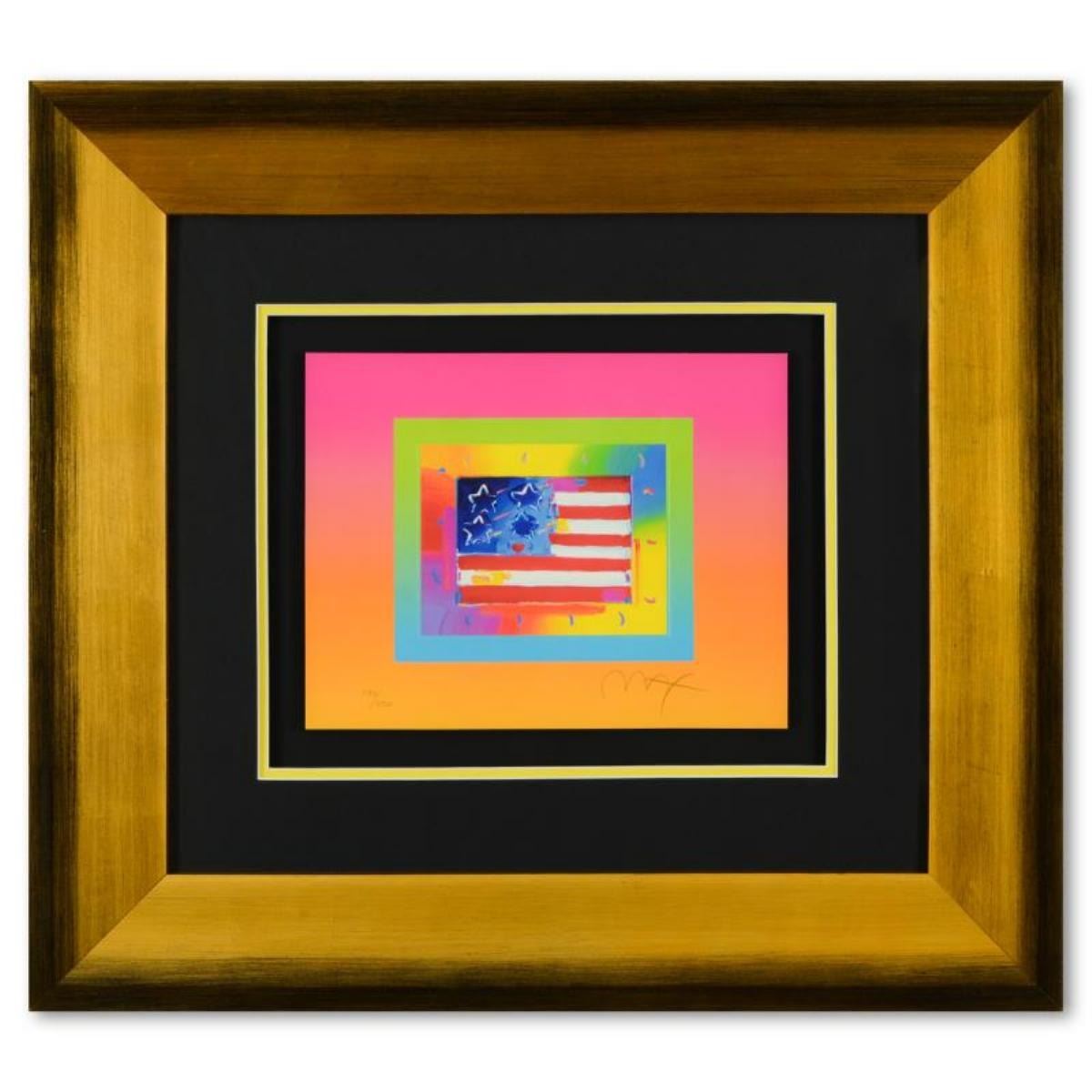 Flag with Heart on Blends by Peter Max. "Flag with Heart on Blends" is a limited edition lithograph on paper by Peter Max, numbered 498/500 and hand signed by the artist. This piece comes framed. Includes Certificate of Authenticity from Peter Max Studios. Measures approximately 27.5" x 24.5" (frame), 12.5" x 10" (image).