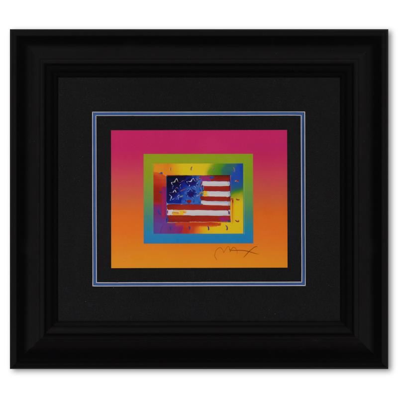 "Flag with Heart on Blends" is a limited edition lithograph on paper by Peter Max, numbered 494/500 and hand signed by the artist. This piece comes framed. Includes Certificate of Authenticity from Peter Max Studios. Measures approximately 27.5" x 24.5" (frame), 12.5" x 10" (image).