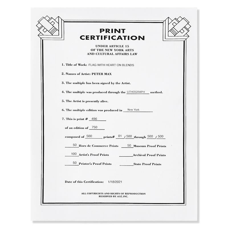 "Flag with Heart on Blends" is a limited edition lithograph on paper by Peter Max, numbered 496/500 and hand signed by the artist. This piece comes framed and includes Certificate of Authenticity from Peter Max Studios. Measures approximately 23.5" x 26 (frame), 10" x 12.5" (image).