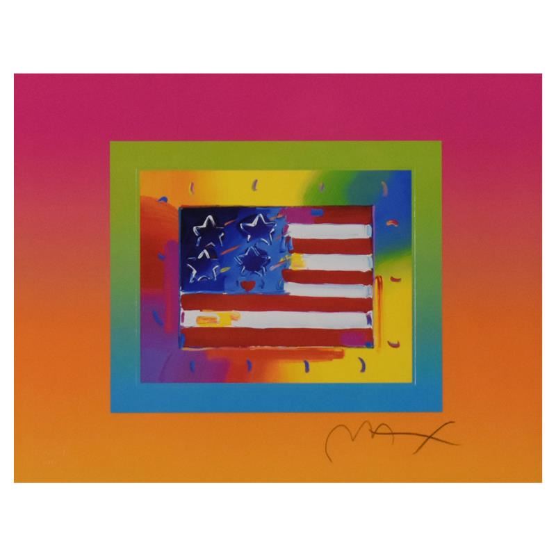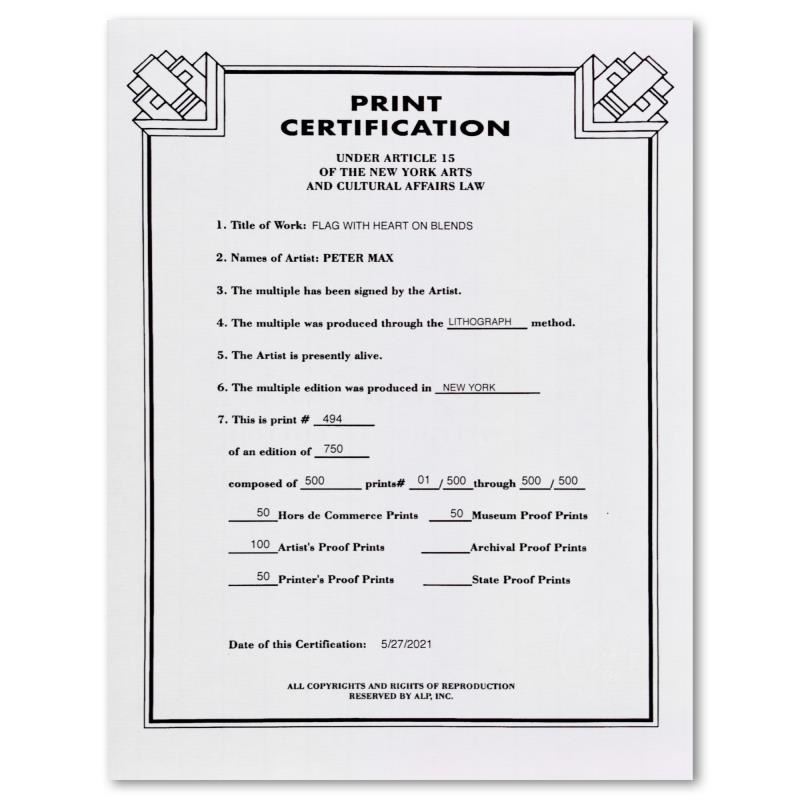 "Flag with Heart on Blends" is a limited edition lithograph on paper by Peter Max, numbered 494/500 and hand signed by the artist. This piece comes framed. Includes Certificate of Authenticity from Peter Max Studios. Measures approximately 27.5" x 24.5" (