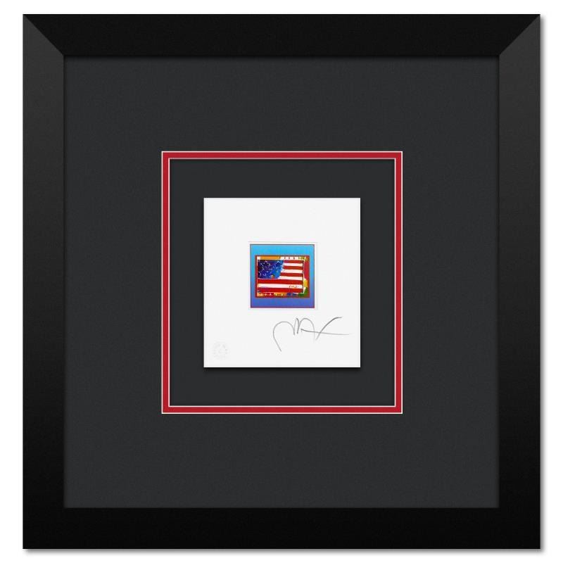 "Flag with Heart on Blue" is a limited edition lithograph on paper by Peter Max numbered and hand signed by the artist. This piece comes framed. Includes Certificate of Authenticity from Peter Max Studios. Measures approx. 15" x 14.5" (frame) 5" x 4.5" (image).