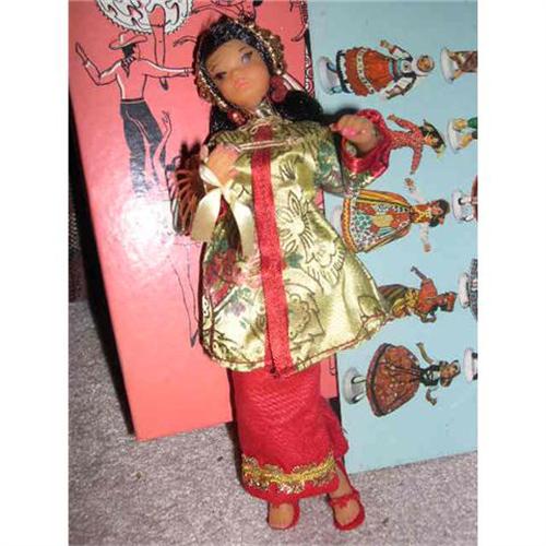 Flagg and Company, Inc. China doll is what is on the box end. She would be a nice example of a different type doll representing an international country. China is one of the harder dolls to find. She is 7" tall with black hair and gold decoration in it. She has separate red high heel shoes. Her outfit is nice and crispy . She has on a half slip with lace trim and she has on panties. She has a gold fan tied to her arm. Her original box is shown and has pictures of all kinds of dolls from different countries. There is a card in the box showing other dolls by the company. She is from a smoke free environment. Buyer to pay $15 for U.S. shipping, insurance, and handling. If you can love her, please bid. Thanks for viewing.