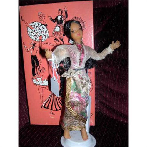 Flagg and Company, Inc. doll representing Burma. The box is marked Burma and she has her stand and someone has written Burma on the base. She is a nice example of a different type doll representing an international country. She is made of rubber and is bendable. She is 7" tall. She has high heel feet but no shoes. Her outfit is nice and crispy. She has dark hair with a group of flowers in the back. The original box is shown and has pictures of all kinds of dolls from different countries. There is a spot on the inside of her hand that the rubber is dug out and one bubble hole on the foot. This was probably original and was just a flaw from production but it is there. She is from a smoke free environment. Buyer to pay $15 for U.S. shipping, insurance, and handling. If you can love her, please bid. Thanks for viewing.