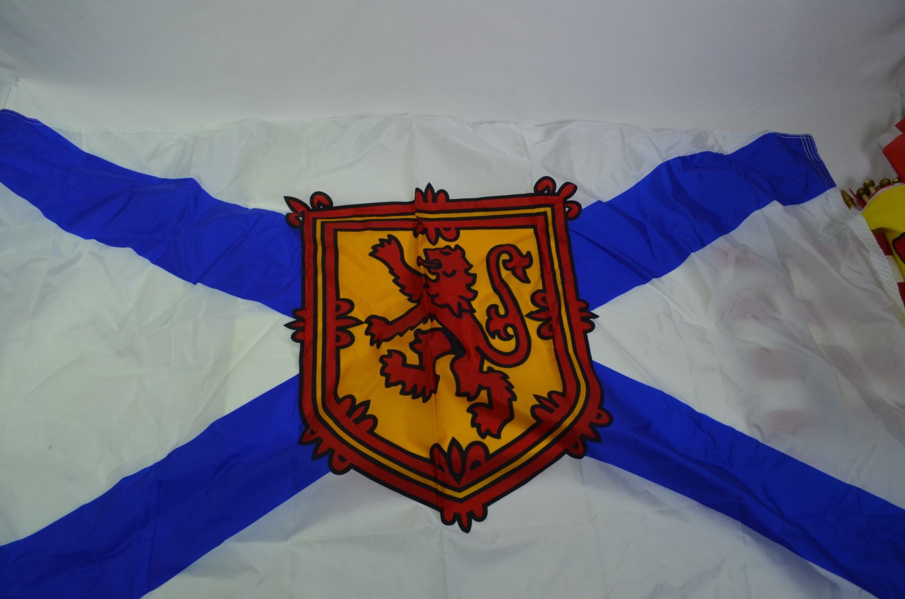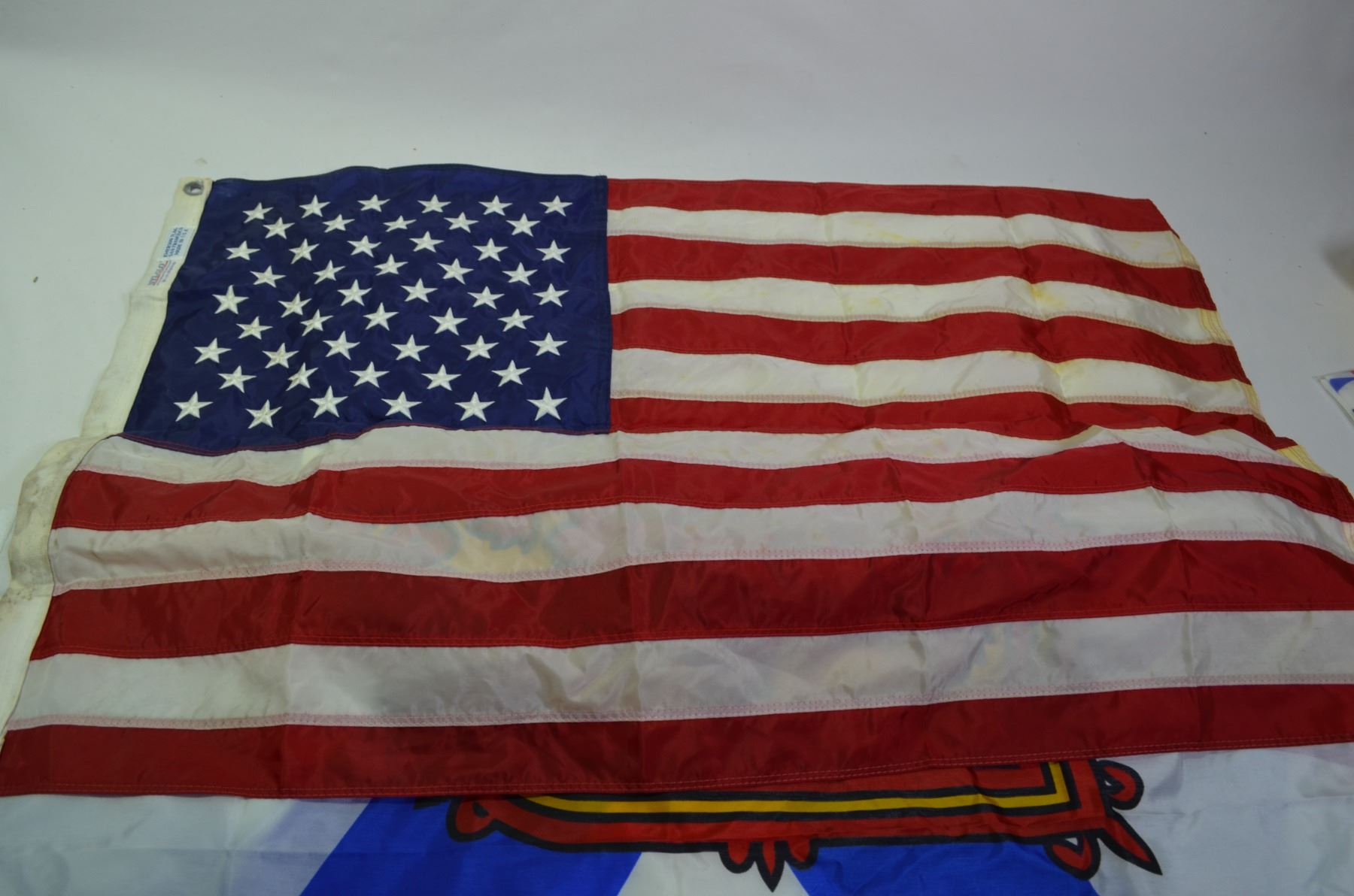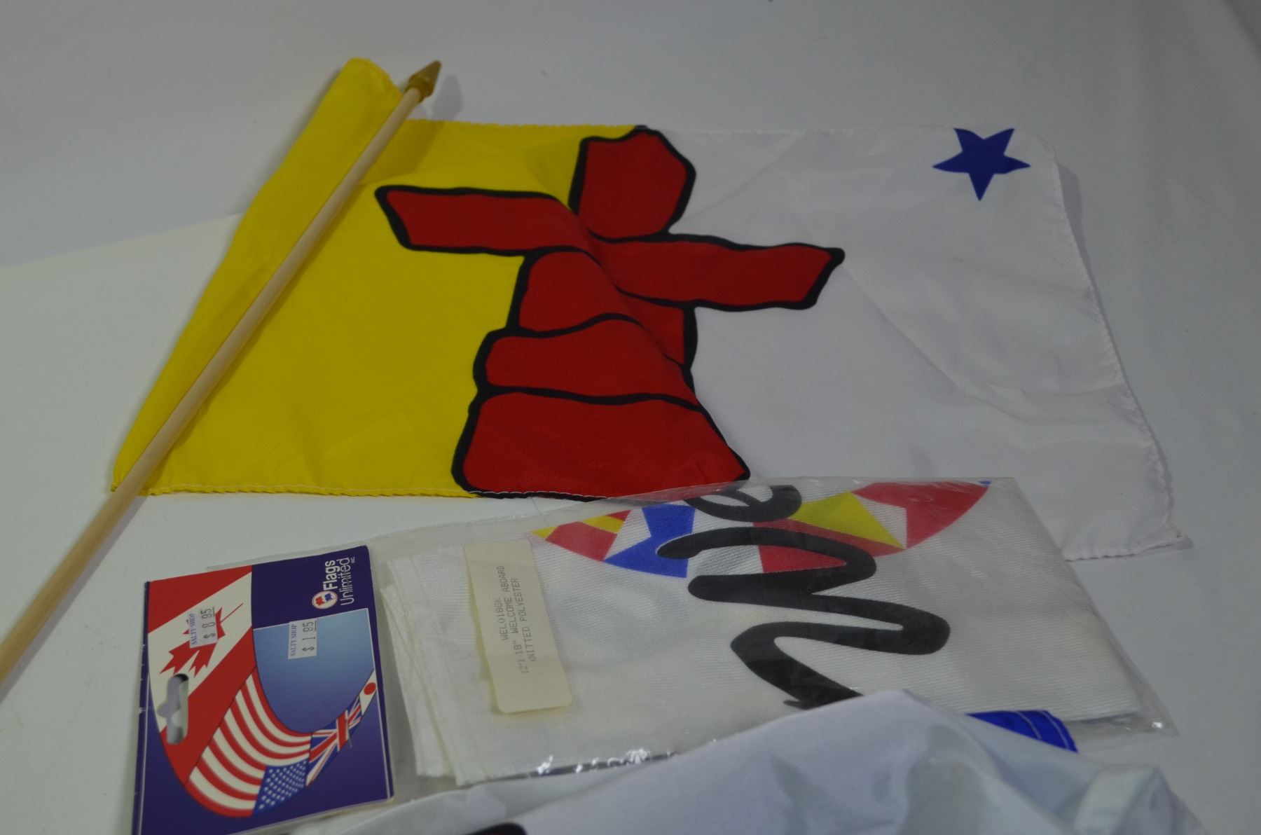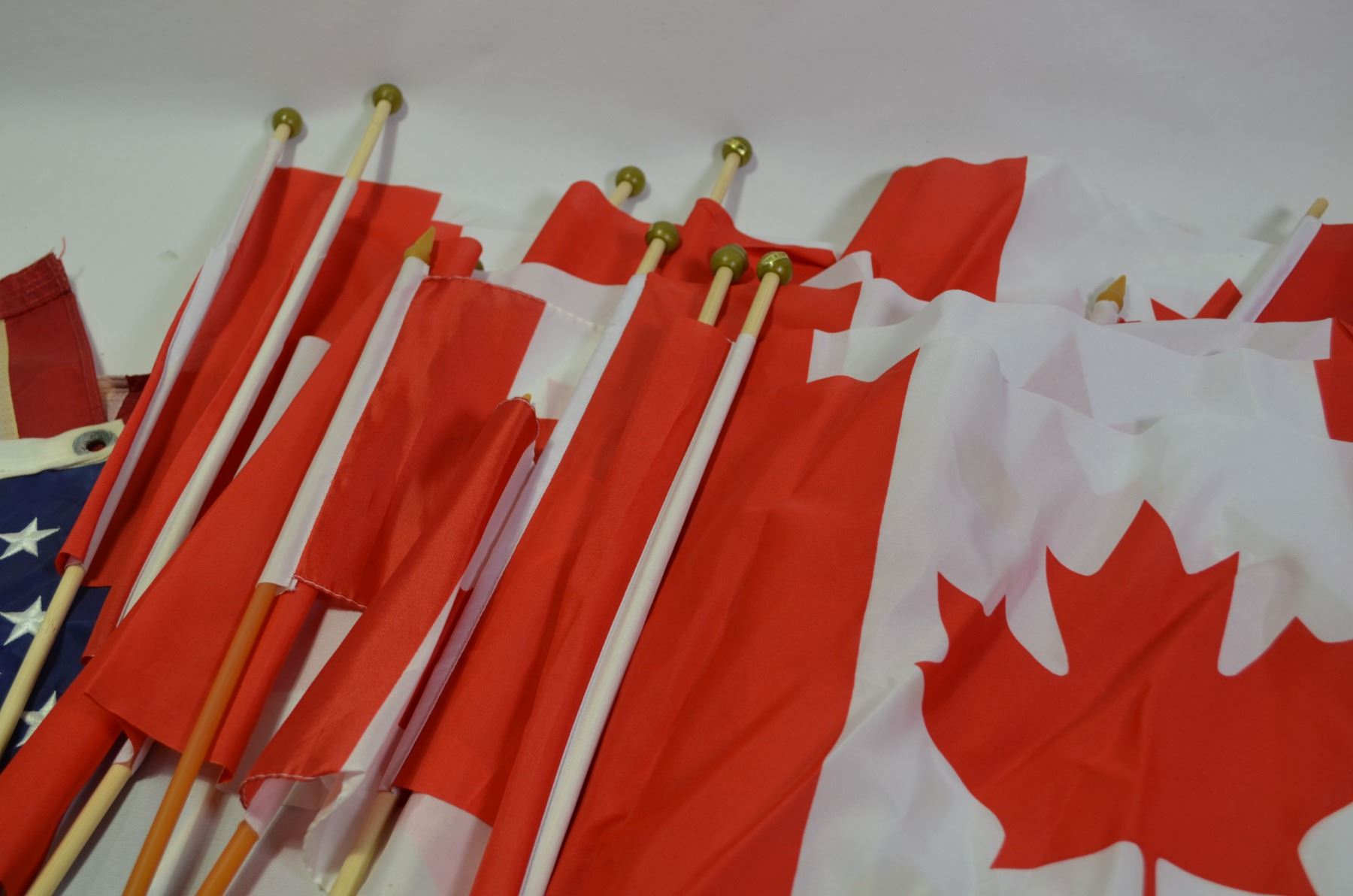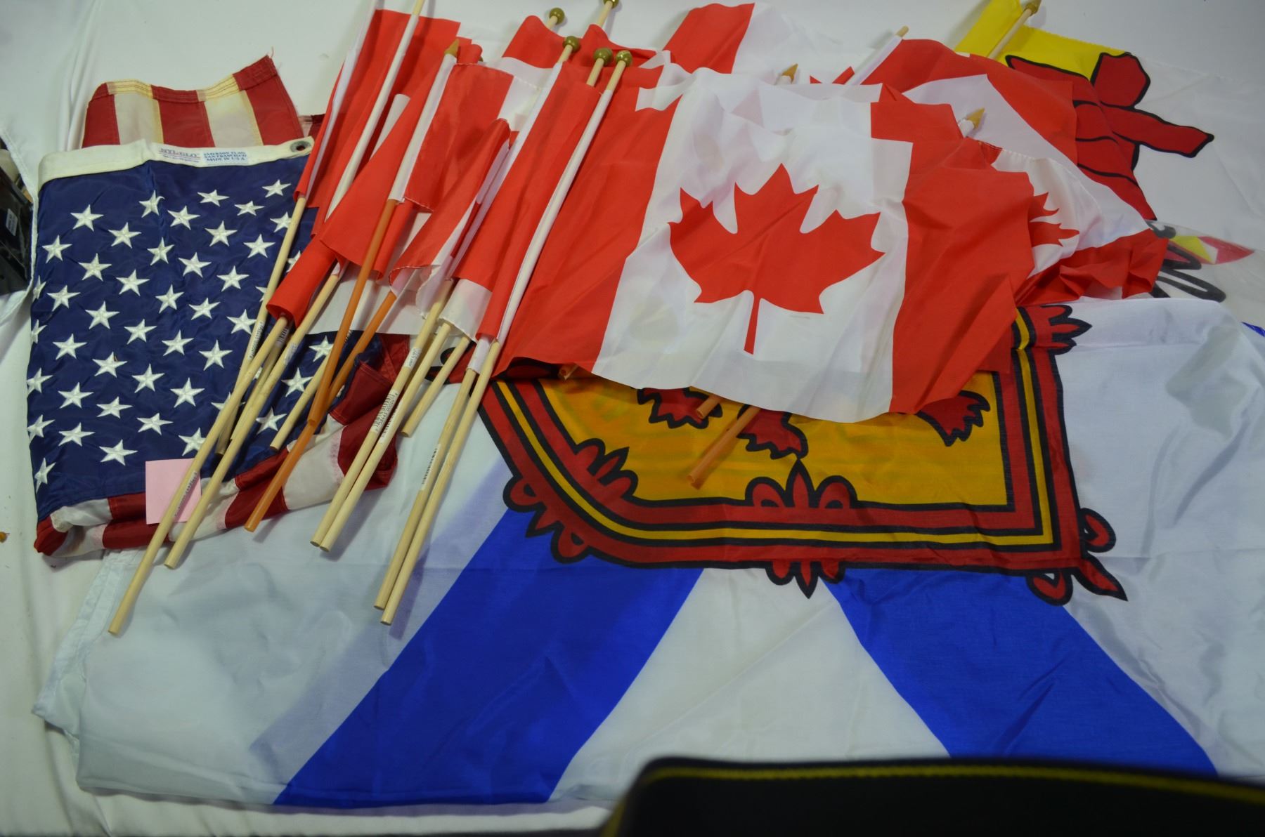 17 Canadian flags of various sizes, plus others. Stitched USA flag by Emerson, 22x36. Large flag approx 3x5 feet