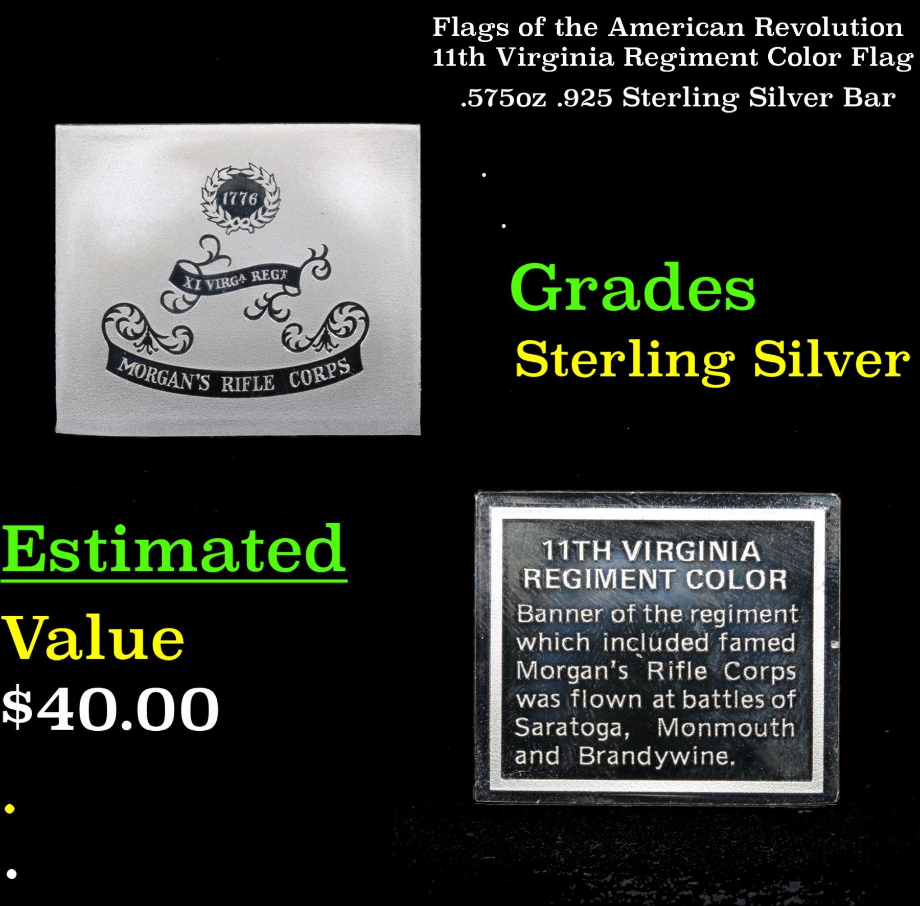 Flags of the American 11th Virginia Regiment Color Flag . . .575oz .925 Sterling Silver Bar Grades.        This vintage Franklin Mint set includes 64 pieces.  We will be bringing the entire set to you throughout all of our Fall Extravaganza auction. This Set of 64 ingots represents different flags of American soldiers during the Revolutionary War . This ingot is "11th Virginia Regiment Color" flag. It is 320 grains of Sterling Silver. Each piece is more beautiful than the next.  A truly wonderful collection.  This is a rare and highly sought after collectible.