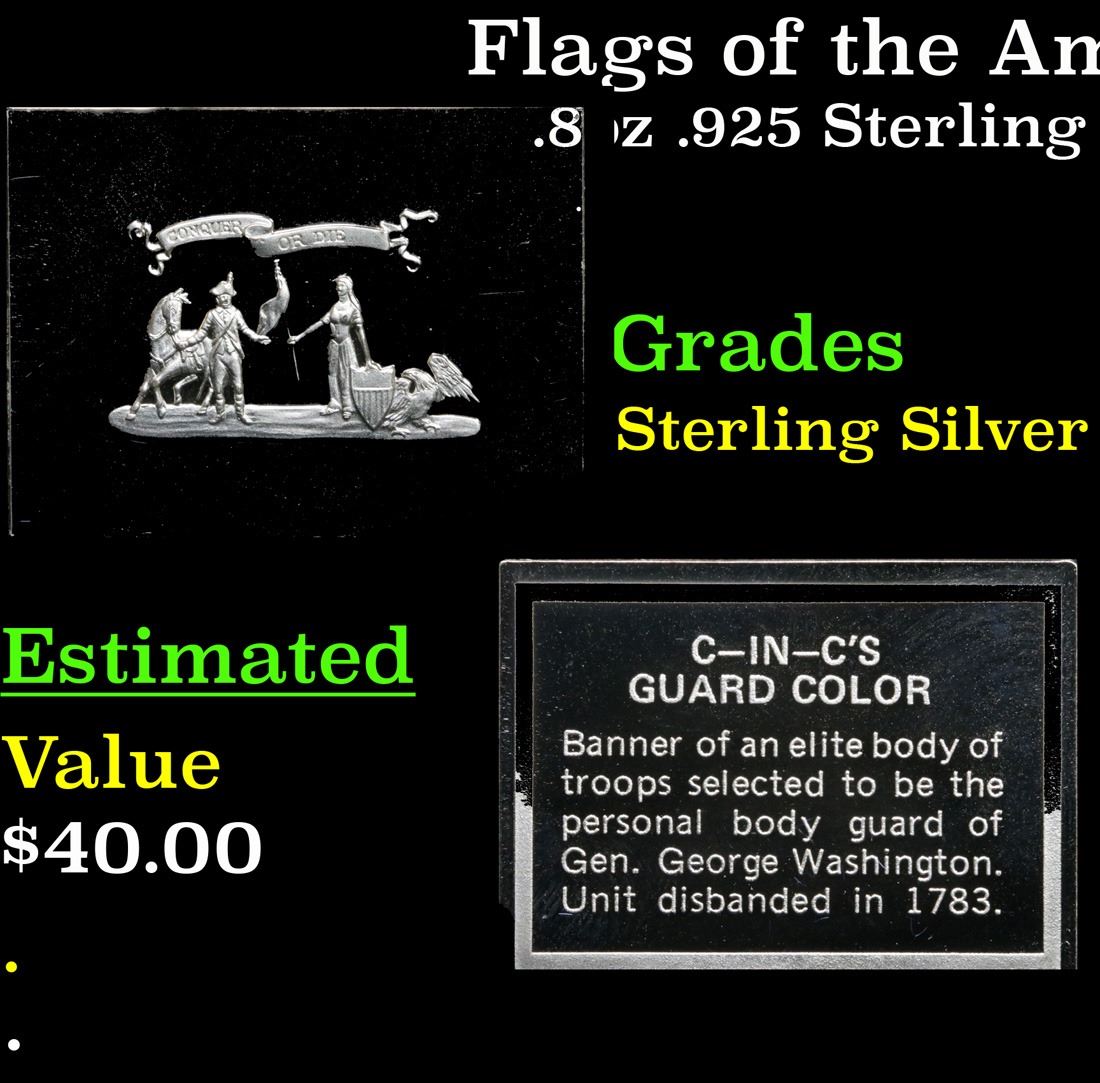 Flags of the American C-In-C Gurd Color . . .8oz .925 Sterling Silver Bar Grades. This vintage Franklin Mint set includes 64 pieces. We will be bringing the entire set to you throughout all of our Fall Extravaganza auction. This Set of 64 ingots represents different flags of American soldiers during the Revolutionary War . This ingot is "C-In-C Guard Colors" flag. It is 365 grains of Sterling Silver. Each piece is more beautiful than the next. A truly wonderful collection. This is a rare and highly sought after collectible.