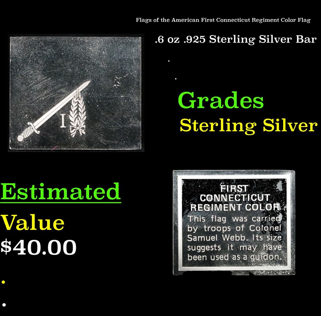 Flags of the American First Connecticut Regiment Color Flag . . .6 oz .925 Sterling Silver Bar Grades. This vintage Franklin Mint set includes 64 pieces. We will be bringing the entire set to you throughout all of our Fall Extravaganza auction. This Set of 64 ingots represents different flags of American soldiers during the Revolutionary War . This ingot is "First Connecticut Regiment Color" flag. It is 320 grains of Sterling Silver. Each piece is more beautiful than the next. A truly wonderful collection. This is a rare and highly sought after collectible.