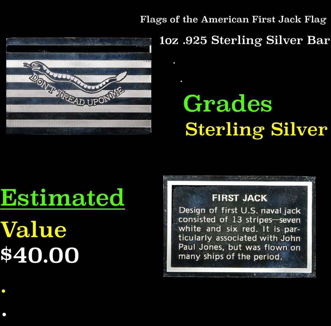 Flags of the American First Jack Flag . . 1oz .925 Sterling Silver Bar Grades. This vintage Franklin Mint set includes 64 pieces. We will be bringing the entire set to you throughout all of our Fall Extravaganza auction. This Set of 64 ingots represents different flags of American soldiers during the Revolutionary War . This ingot is "First Jack" flag. It is 415 grains of Sterling Silver. Each piece is more beautiful than the next. A truly wonderful collection. This is a rare and highly sought after collectible.