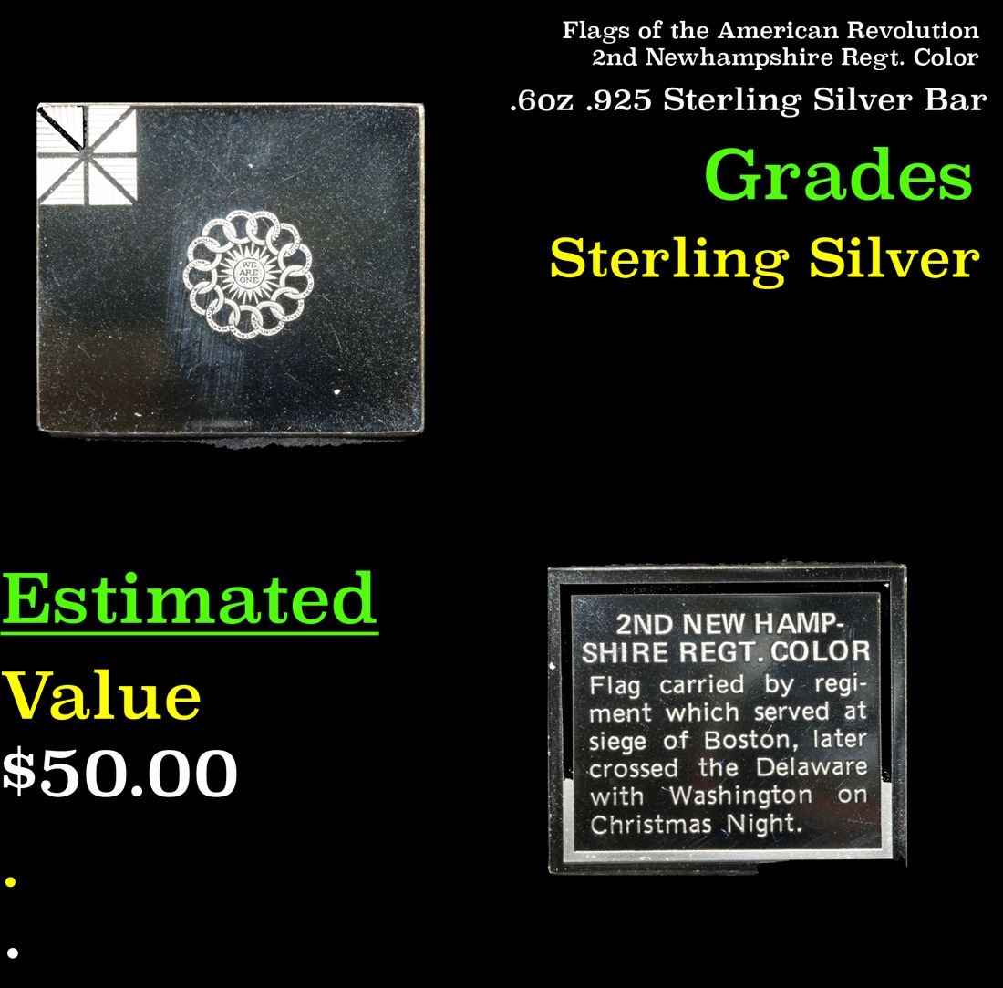 Flags of the American Revolution 2nd Newhampshire Regt. Color . . .6oz .925 Sterling Silver Bar Grades. This vintage Franklin Mint set includes 64 pieces. We will be bringing the entire set to you throughout all of our Fall Extravaganza auction. This Set of 64 ingots represents different flags of American soldiers during the Revolutionary War . This ingot is "2nd New Hampshire Regt. Color" flag. It is 320 grains of Sterling Silver. Each piece is more beautiful than the next. A truly wonderful collection. This is a rare and highly sought after collectible.