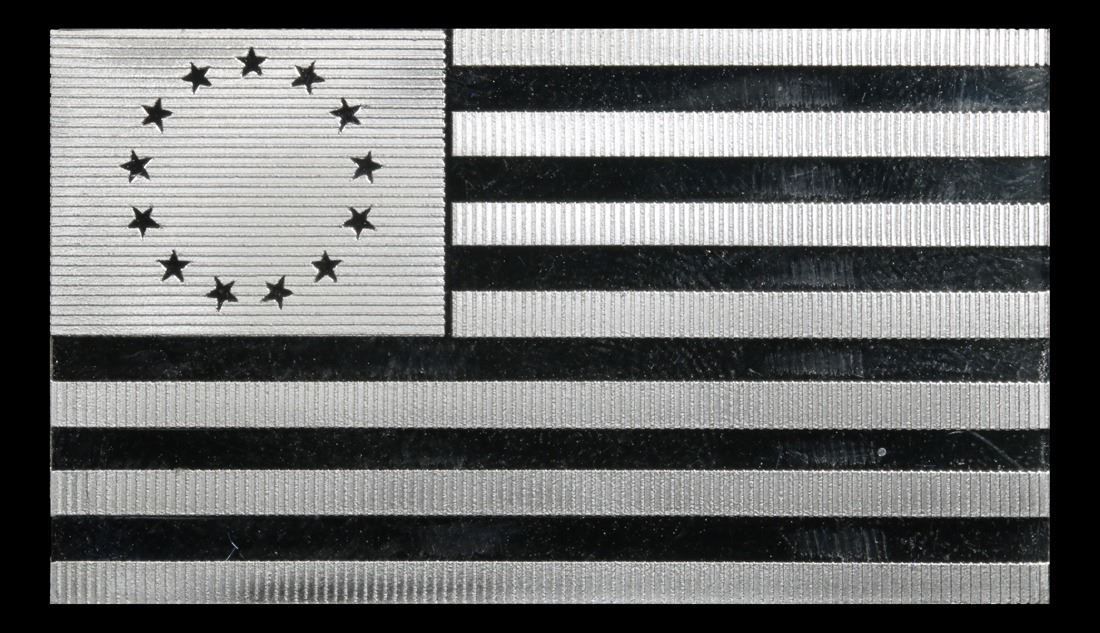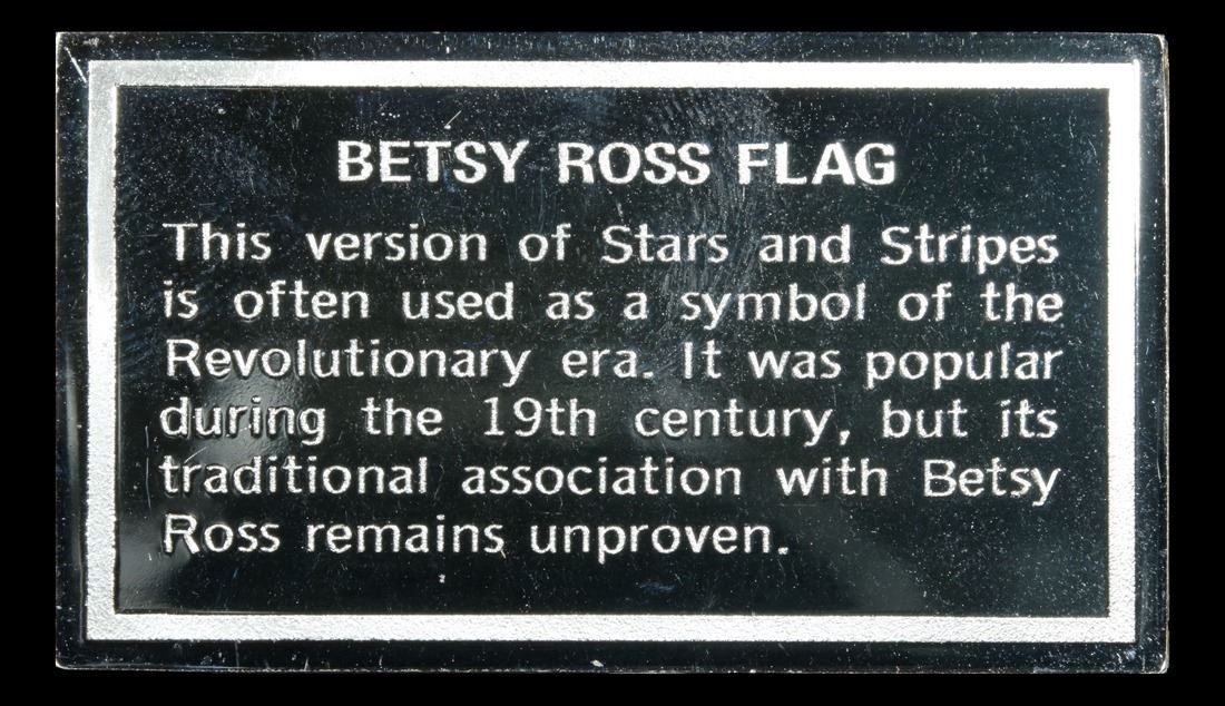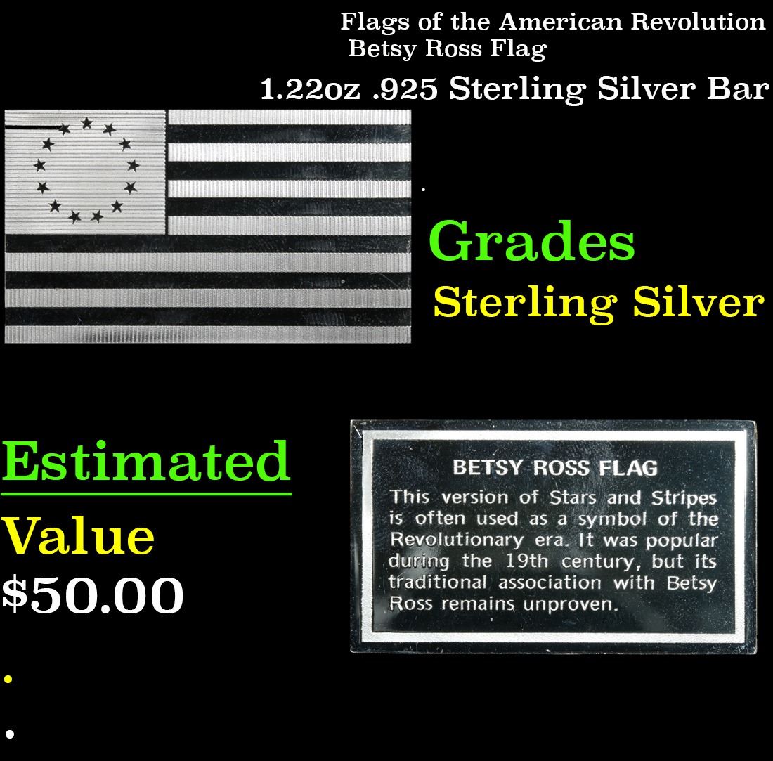 Flags of the American Revolution Betsy Ross Flag . . .925 Sterling Silver Bar Grades. This vintage Franklin Mint set includes 64 pieces. We will be bringing the entire set to you throughout all of our Fall Extravaganza auction. This Set of 64 ingots represents different flags of American soldiers during the Revolutionary War . This ingot is "Betsy Ross" flag. It is 245 grams of Sterling Silver. Each piece is more beautiful than the next. A truly wonderful collection. This is a rare and highly sought after collectible.
