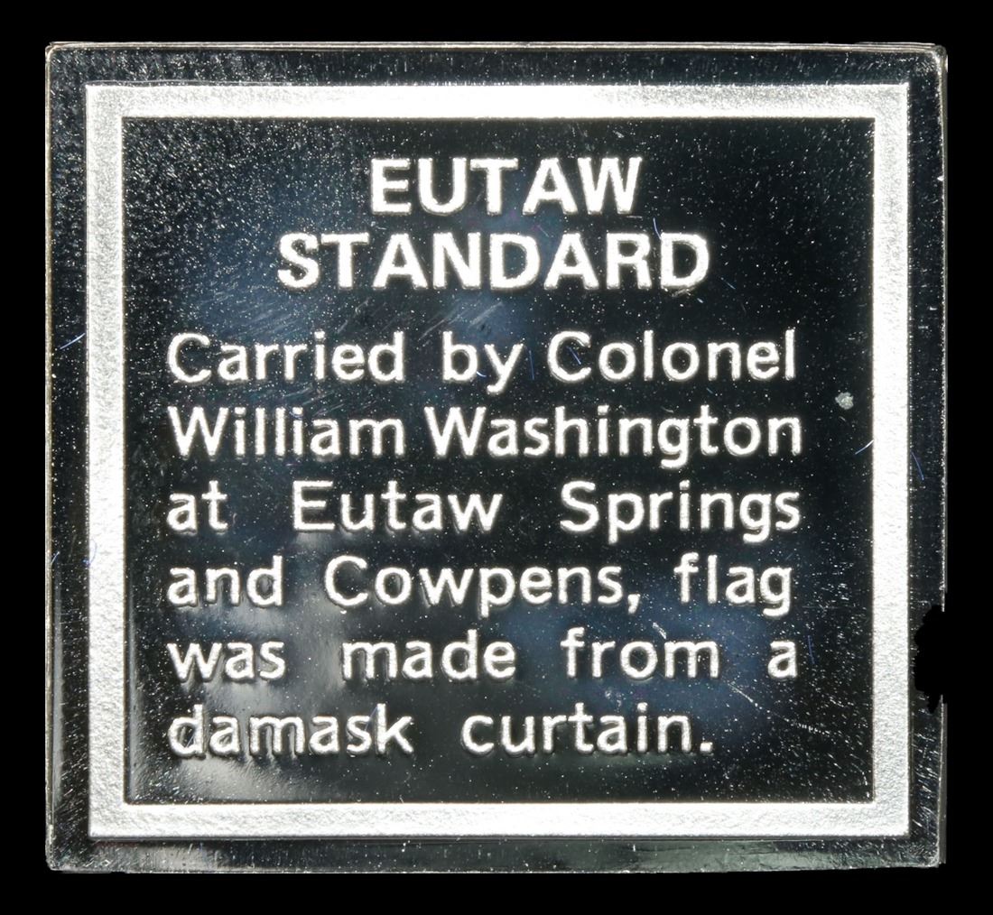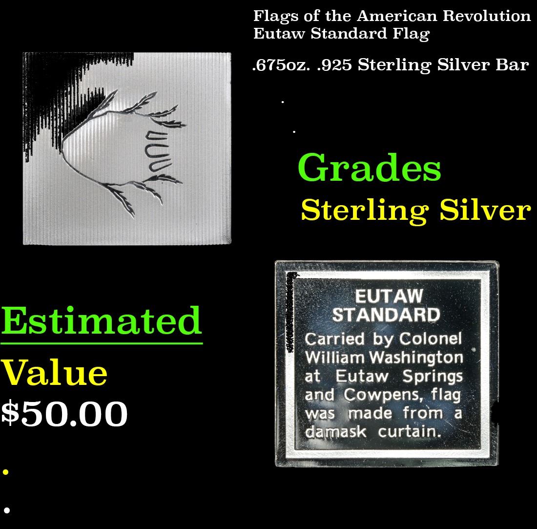 Flags of the American Revolution Eutaw Standard Flag . . .925 Sterling Silver Bar Grades. This vintage Franklin Mint set includes 64 pieces. We will be bringing the entire set to you throughout all of our Fall Extravaganza auction. This Set of 64 ingots represents different flags of American soldiers during the Revolutionary War . This ingot is "Eutaw Standard" flag. It is 245 grams of Sterling Silver. Each piece is more beautiful than the next. A truly wonderful collection. This is a rare and highly sought after collectible.