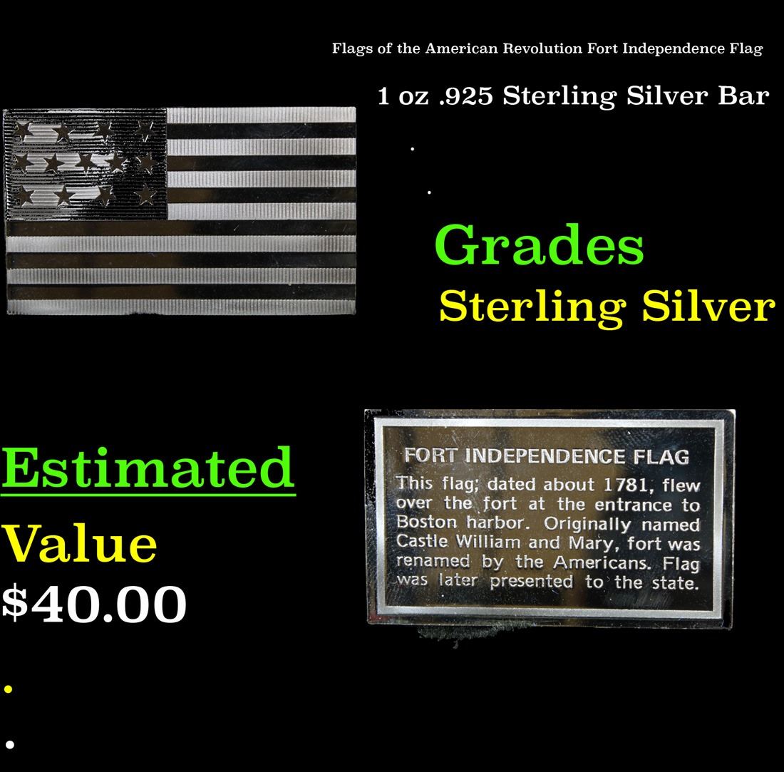 Flags of the American Revolution Fort Independence Flag . . 1 oz .925 Sterling Silver Bar Grades. This vintage Franklin Mint set includes 64 pieces. We will be bringing the entire set to you throughout all of our Fall Extravaganza auction. This Set of 64 ingots represents different flags of American soldiers during the Revolutionary War . This ingot is "Fort Independence" flag. It is 460 grains of Sterling Silver. Each piece is more beautiful than the next. A truly wonderful collection. This is a rare and highly sought after collectible.